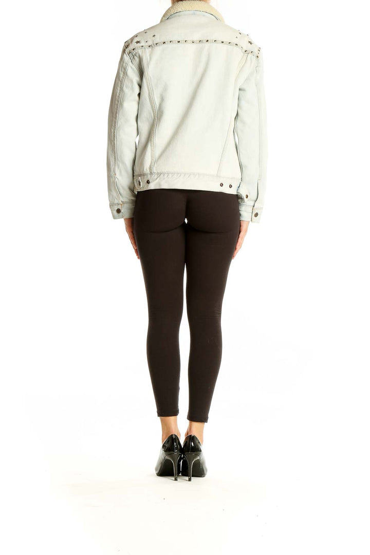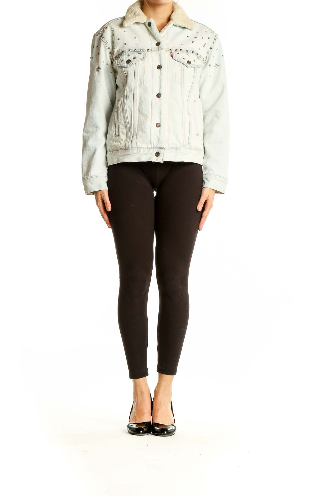 Make a statement with this eye-catching light blue denim jacket from Levi's. Featuring an all-over studded design on the upper body and shoulders, this jacket combines classic style with a bold, edgy twist. The soft sherpa collar adds warmth and texture, perfect for transitional weather. Crafted from a durable cotton-polyester blend, it offers both comfort and longevity. The traditional button-front closure and chest pockets maintain the iconic denim jacket silhouette. In good condition, this size small jacket is a versatile piece that can elevate any casual outfit. With its unique embellishments and timeless Levi's quality, this jacket is sure to become a standout piece in your wardrobe.