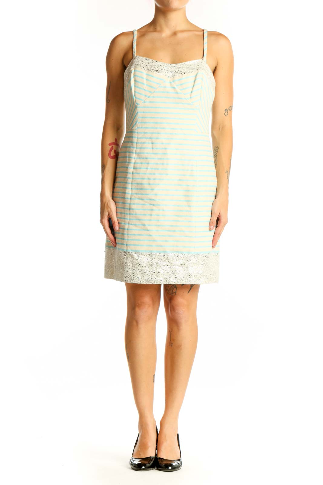 Step into summer with this charming Lilly Pulitzer sundress in a refreshing mint green and white stripe pattern. The sleeveless design features delicate lace trim along the neckline and hem, adding a touch of feminine elegance to the casual silhouette. Crafted from a comfortable blend of cotton, metallic threads, and polyester, this dress offers both style and breathability for warm days.