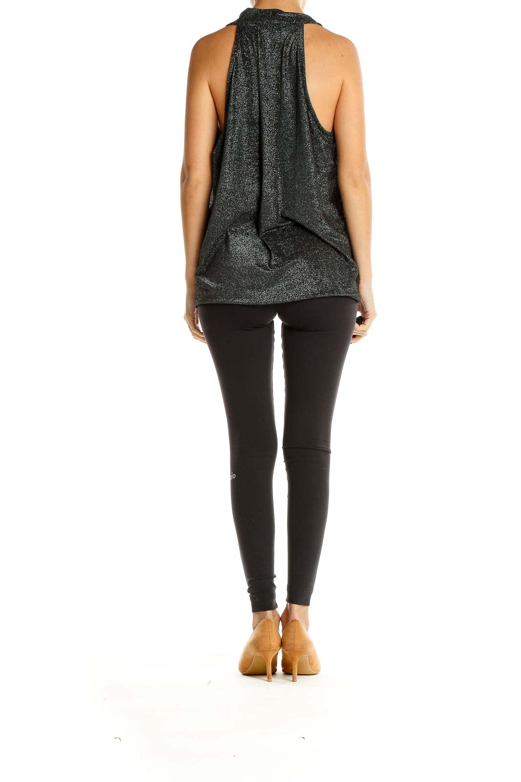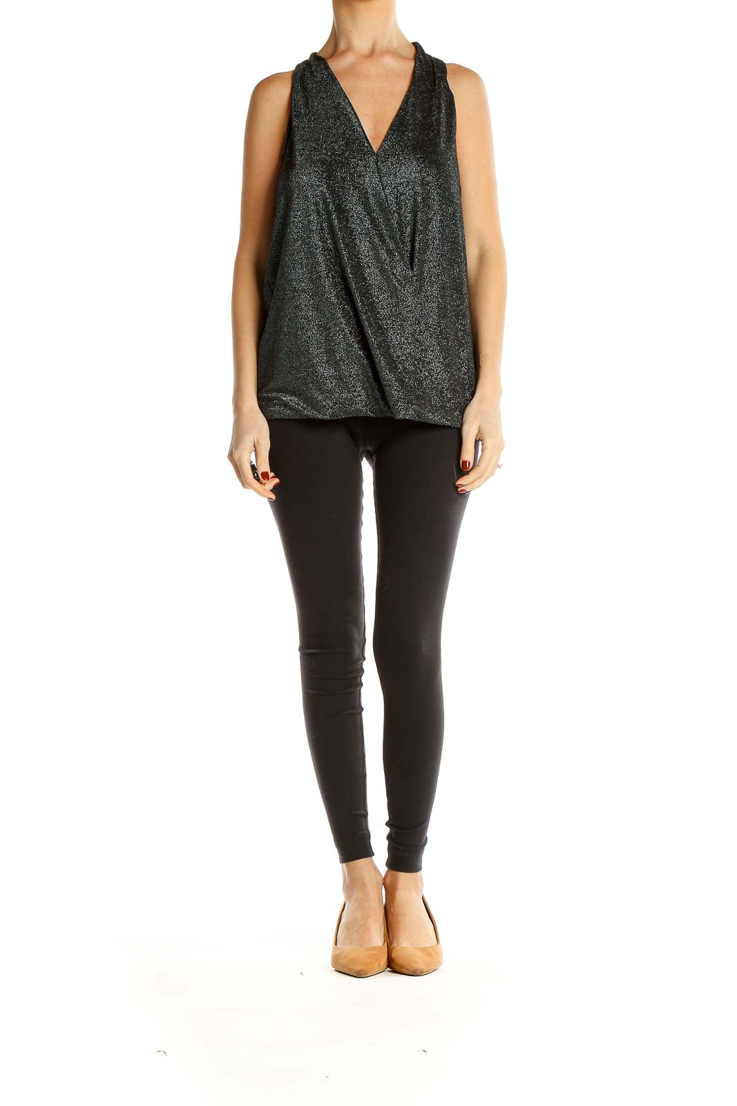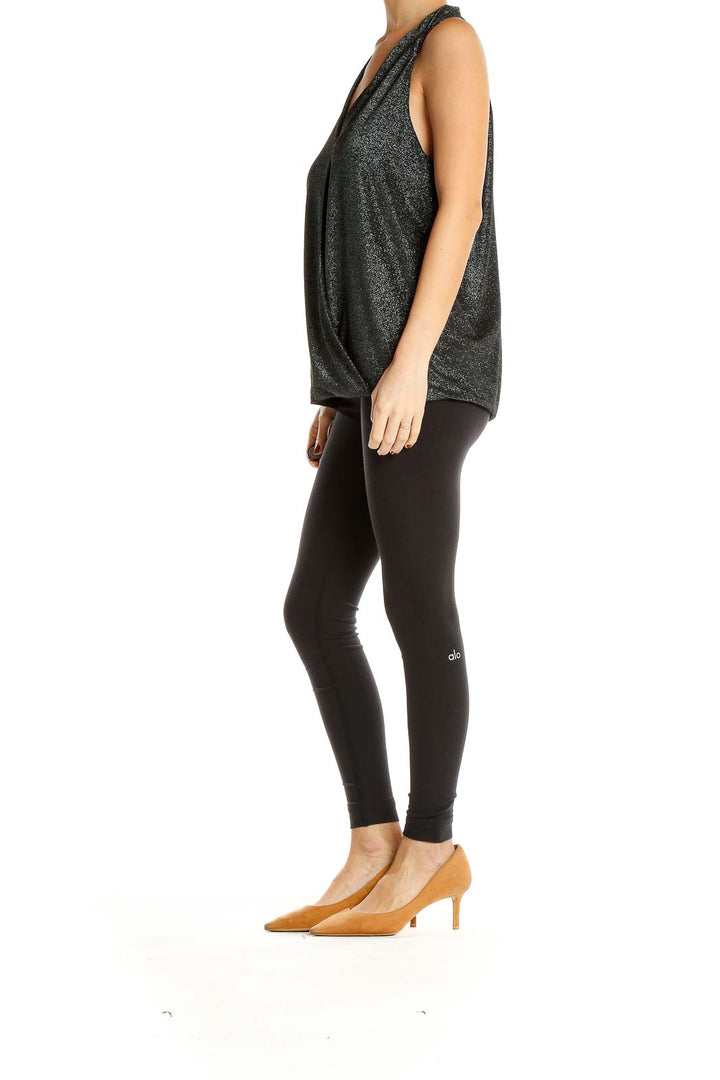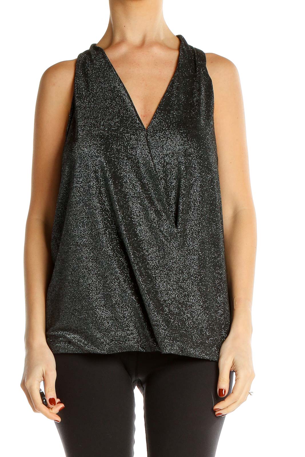 Elevate your wardrobe with this stunning black shimmering sleeveless top from Liverpool Jeans Company. The wrap-style design creates a flattering V-neckline that adds a touch of sophistication to any outfit. Made with a luxurious metallic fabric, this top catches the light beautifully, making it perfect for both day and evening wear.