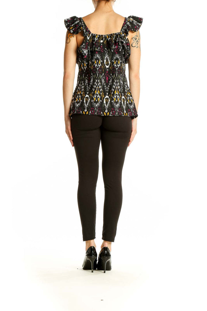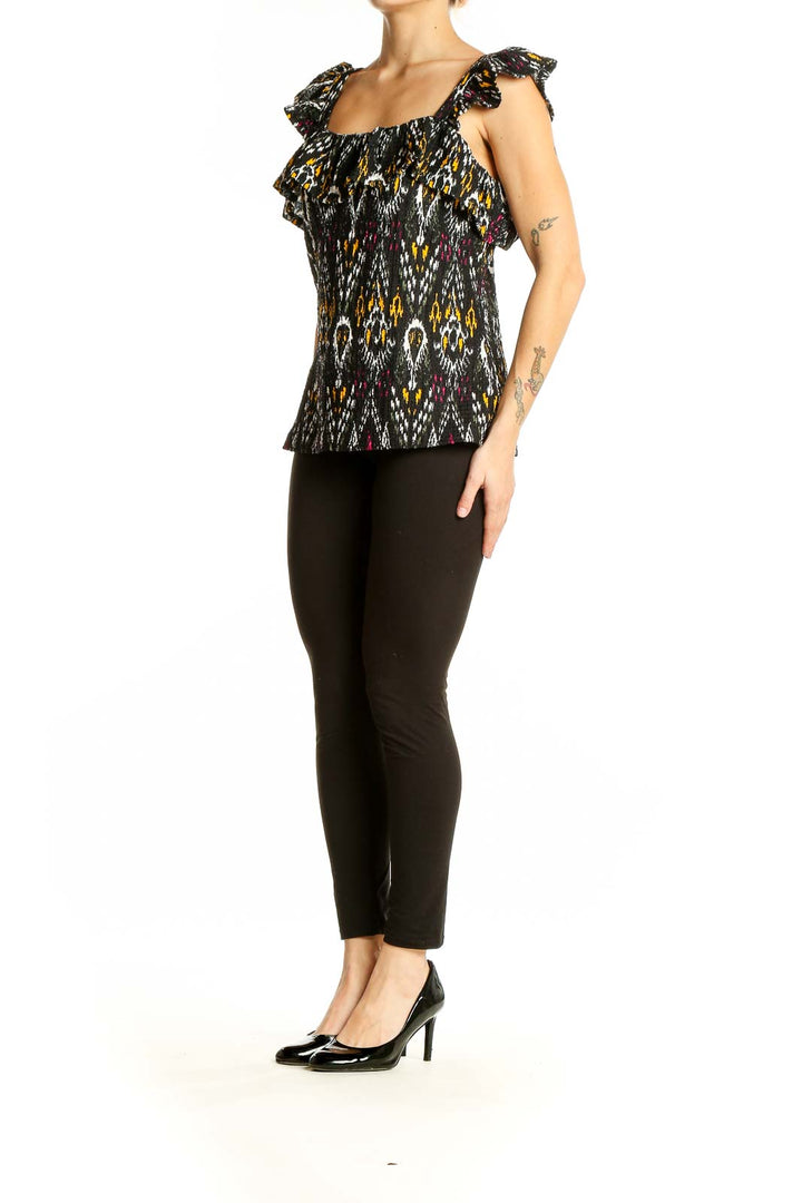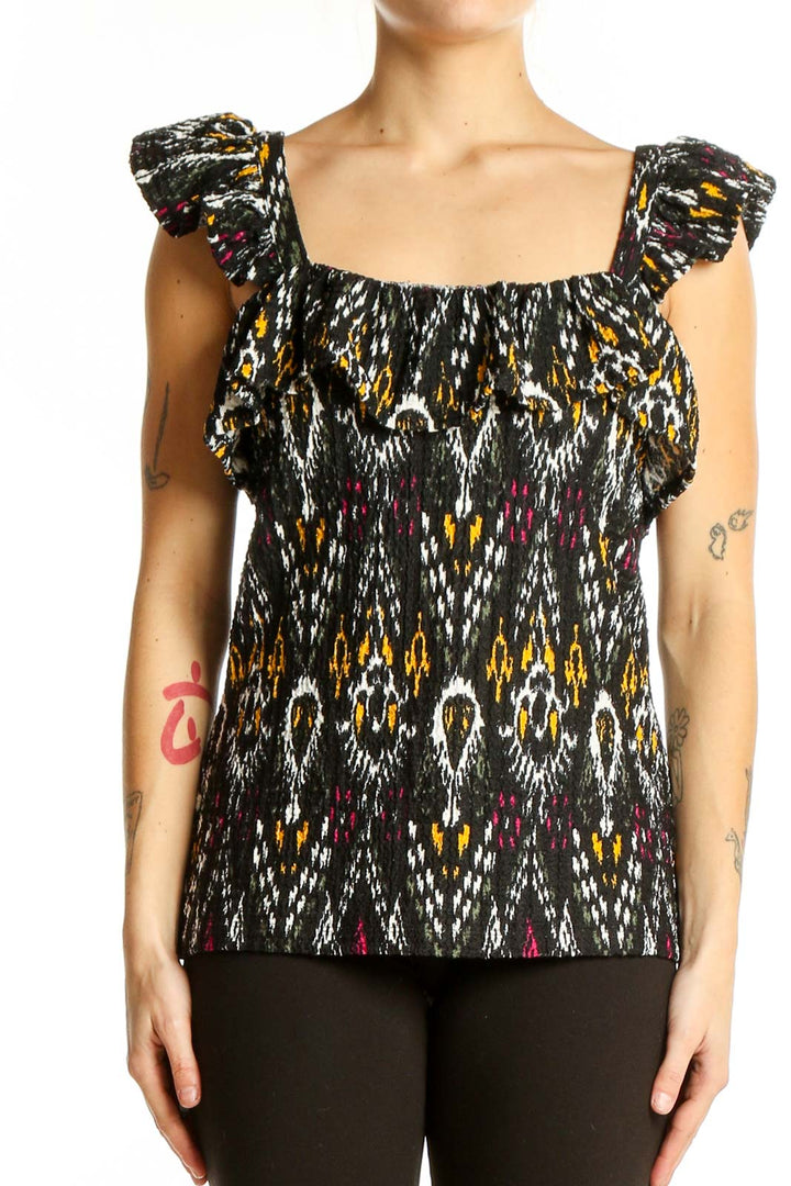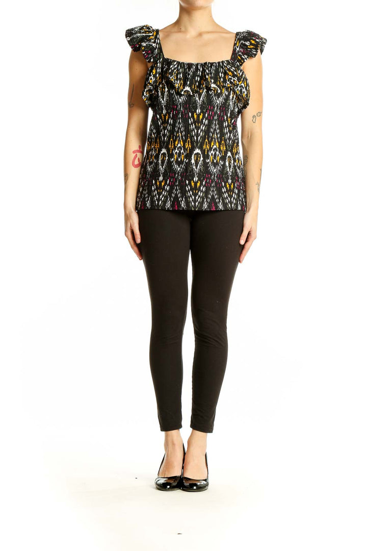 Make a statement with this eye-catching Black Patterned Ruffle Sleeve Top from LOFT. The striking ikat-inspired print in black, white, yellow, and burgundy creates a bold and stylish look that's sure to turn heads. Crafted from a comfortable blend of polyester and spandex, this top offers both style and ease of wear.