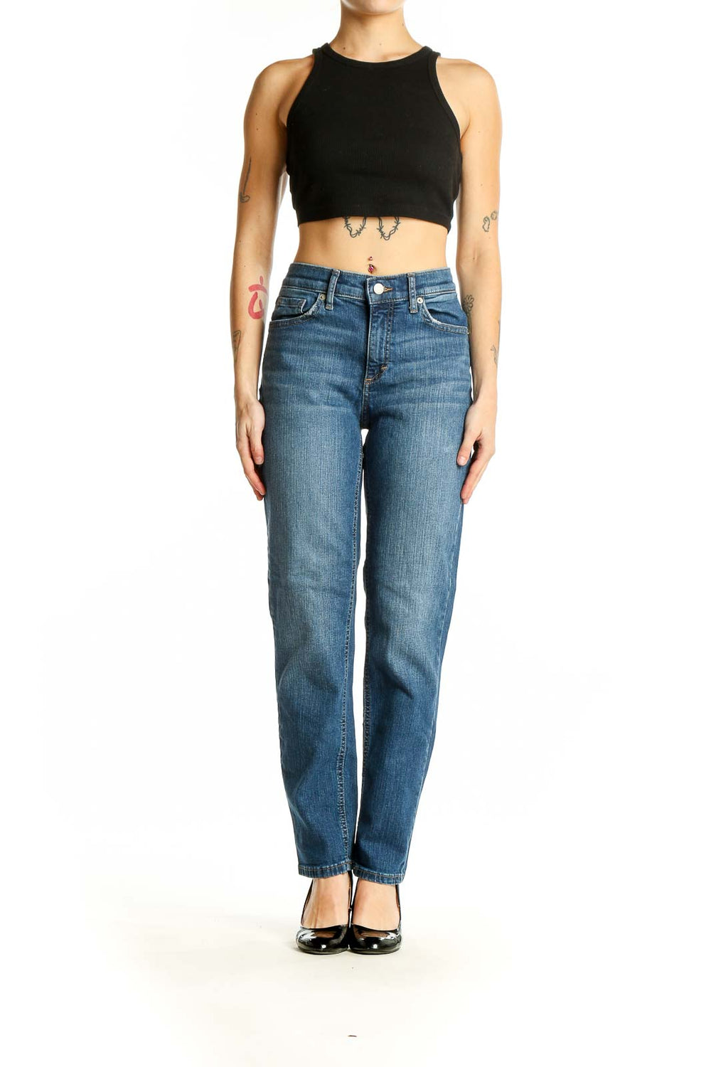 Designed with a flattering straight leg silhouette, these jeans sit comfortably at the waist and maintain a consistent width from hip to ankle. The traditional five-pocket styling and subtle contrast stitching add classic denim details. With a 39-inch length, these jeans are perfect for pairing with your favorite heels or flats.