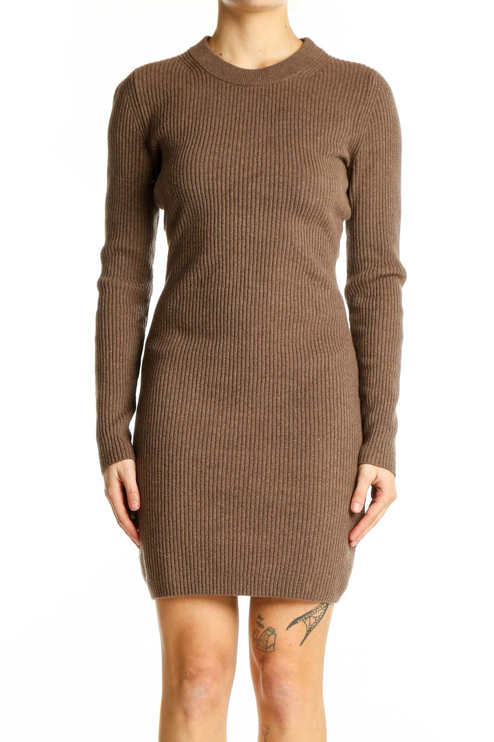 Featuring a classic crew neckline and long sleeves, this versatile piece can be easily dressed up or down. The knee-length cut offers a modest yet fashionable look, making it suitable for various settings. The rich brown hue is perfect for autumn and winter wardrobes, but can be styled for year-round wear.