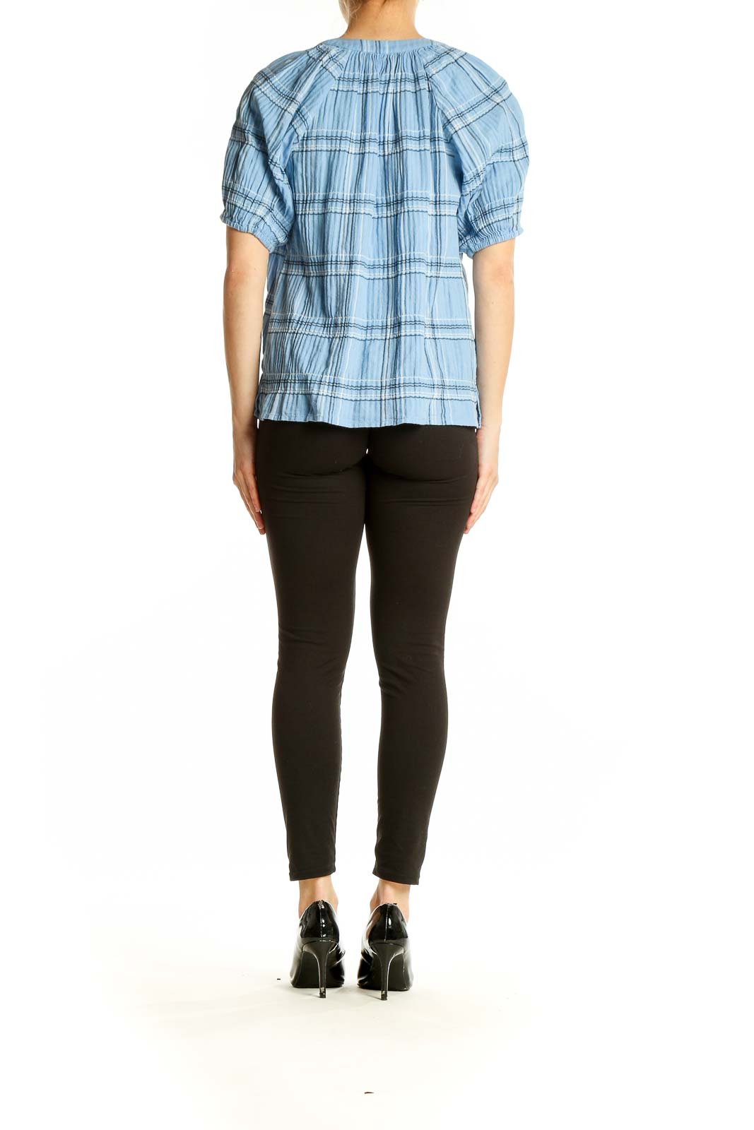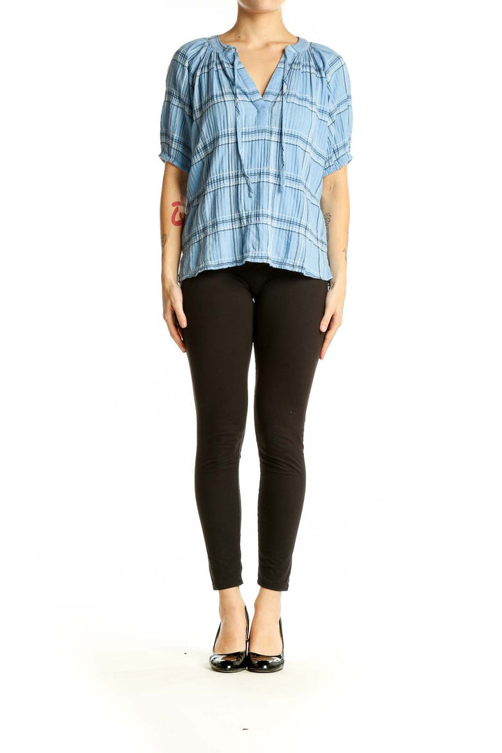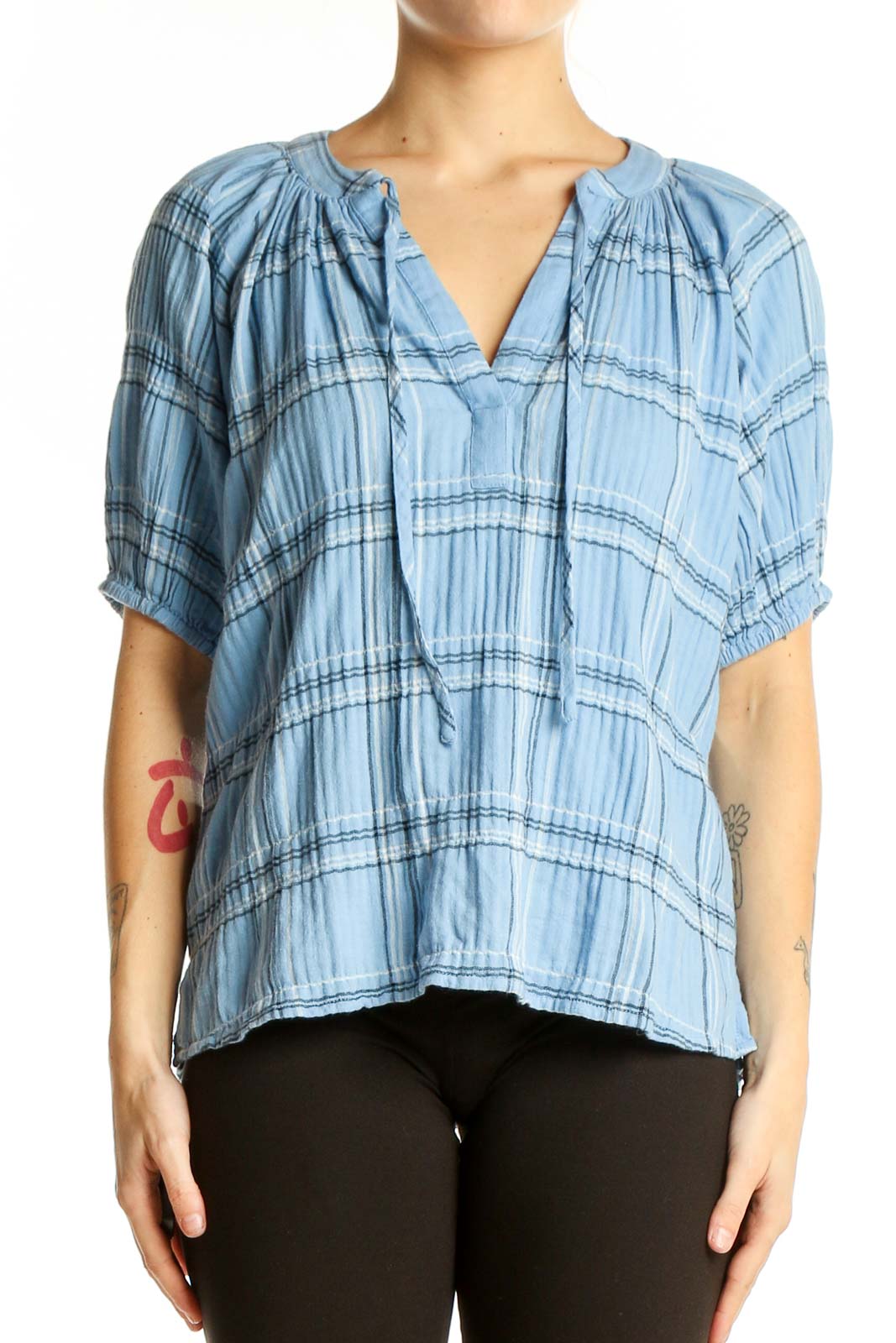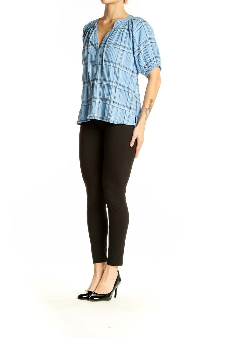 Elevate your casual wardrobe with this charming light blue plaid top from LOFT. Crafted from a comfortable blend of cotton and spandex, this top offers both style and ease of movement. The airy design features a flattering V-neckline and short, slightly puffed sleeves that add a touch of femininity. The all-over plaid pattern in shades of blue creates a fresh, summery look that's perfect for warm days or layering.