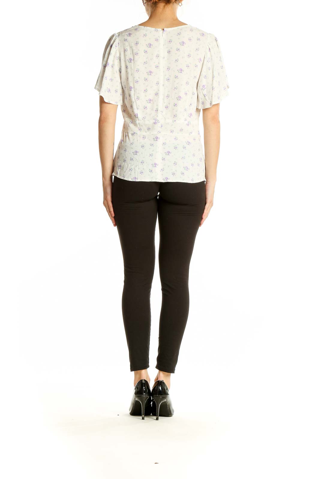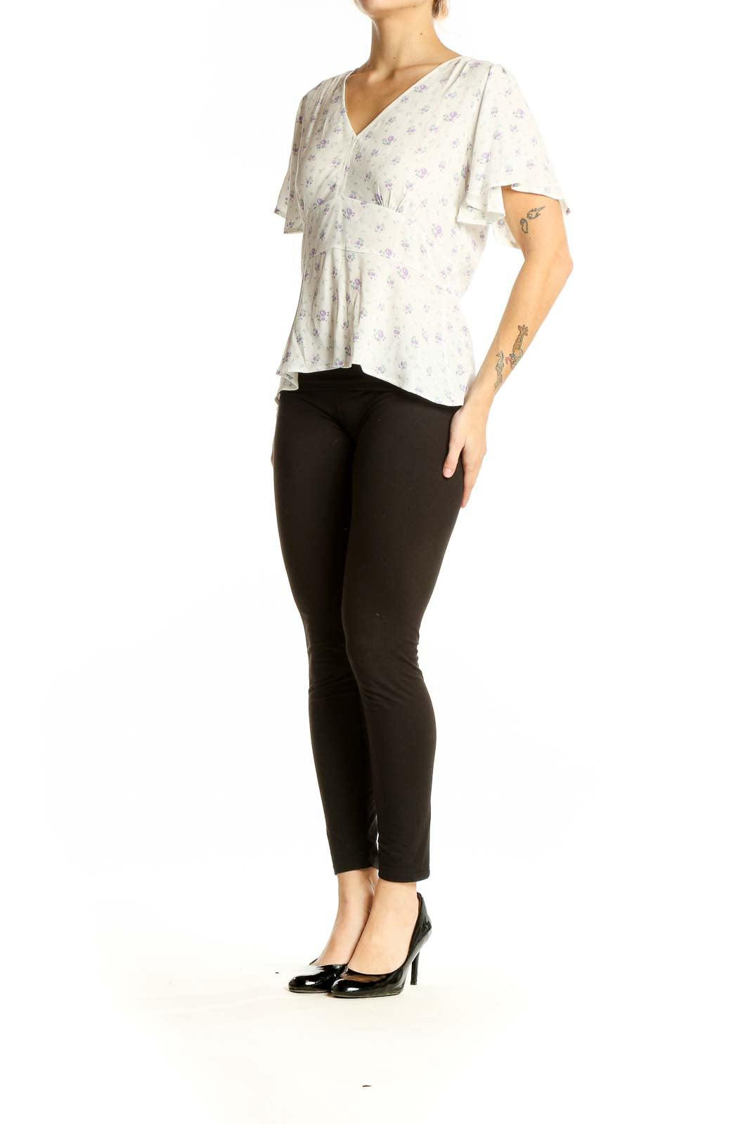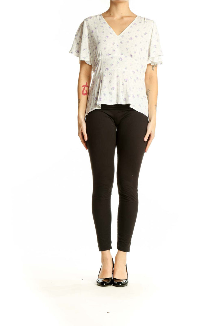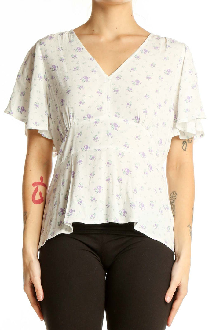 Elevate your wardrobe with this charming white floral blouse from LOFT. Crafted from soft and lightweight rayon, this top features a delicate lavender floral print that adds a touch of feminine elegance to any outfit. The flutter sleeves provide a breezy, romantic silhouette, while the V-neckline offers a flattering frame for your décolletage. With its versatile design, this blouse can easily transition from office to weekend wear. The peplum-style hem creates a flattering shape, accentuating your waistline. New with tags, this size Small top is in pristine condition, ready to become a staple in your wardrobe. Its measurements ensure a comfortable fit for a variety of body types. Pair this lovely blouse with your favorite jeans for a casual look, or dress it up with a pencil skirt for a more polished ensemble.