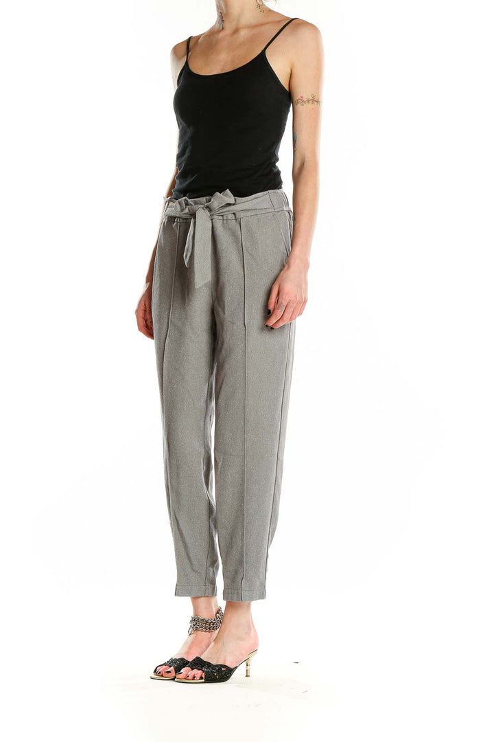 Elevate your wardrobe with these sophisticated gray ankle-length trousers from LOFT Outlet. Crafted from a luxurious blend of polyester, rayon, and spandex, these pants offer both comfort and style. The high-waisted design features a flattering paper bag waist with a self-tie belt, adding a touch of elegance to your look. Pleated detailing down the front creates a sleek silhouette, while the tapered leg ends at a chic ankle length. Perfect for both office wear and casual outings, these versatile trousers can be easily dressed up or down. In excellent condition, these pants are a must-have addition to any fashion-forward closet.