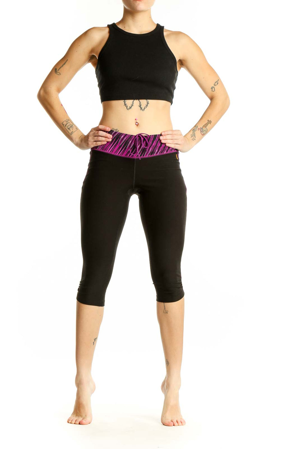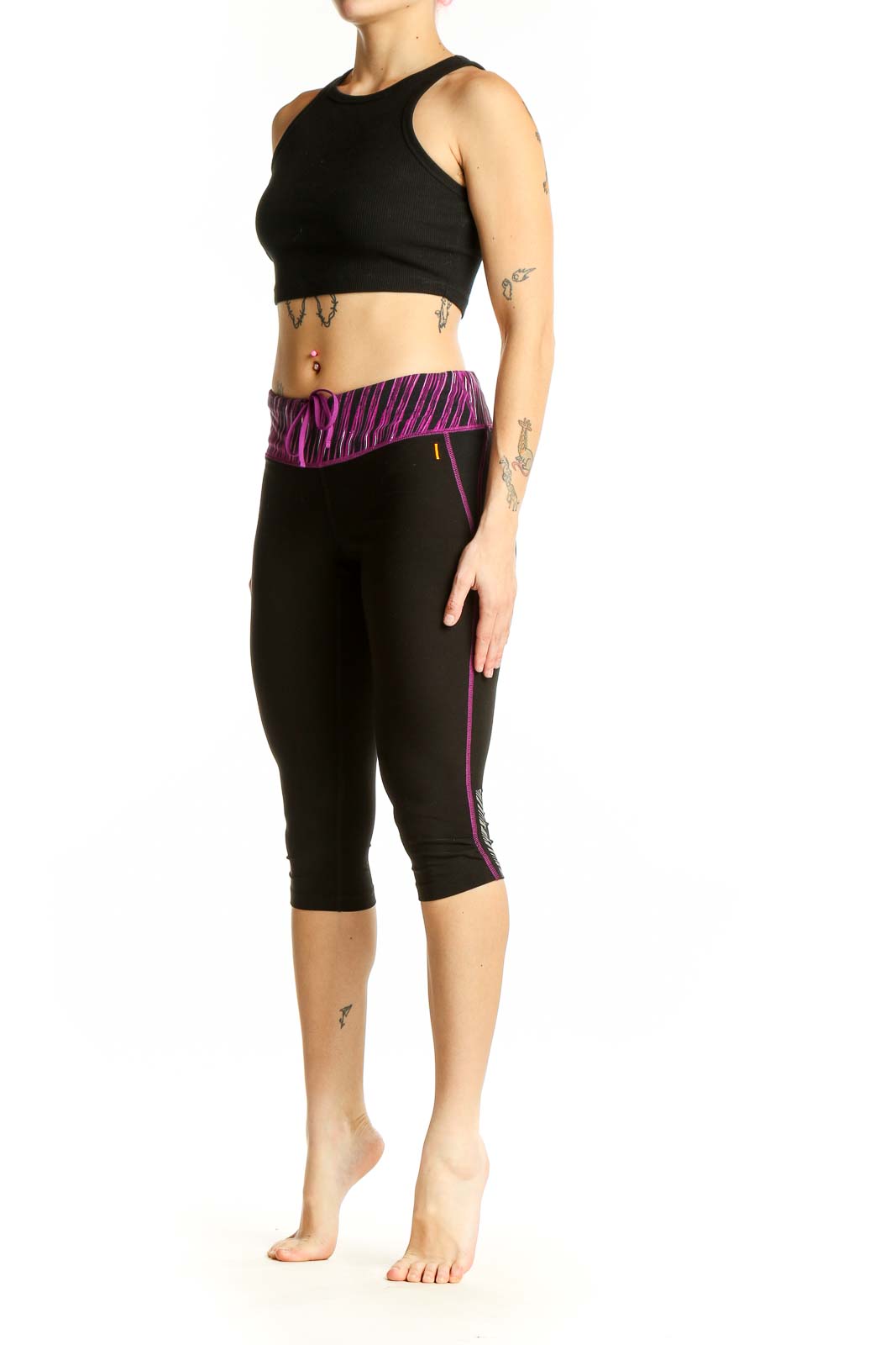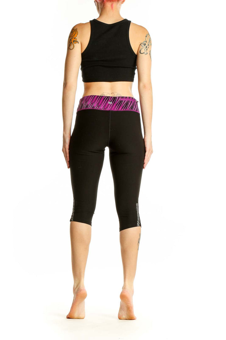 Elevate your workout wardrobe with these sleek black capri leggings from Lucy. Featuring a vibrant purple and black patterned waistband, these leggings offer both style and functionality for your active lifestyle. The form-fitting design hugs your curves while providing excellent support and flexibility during any exercise routine.