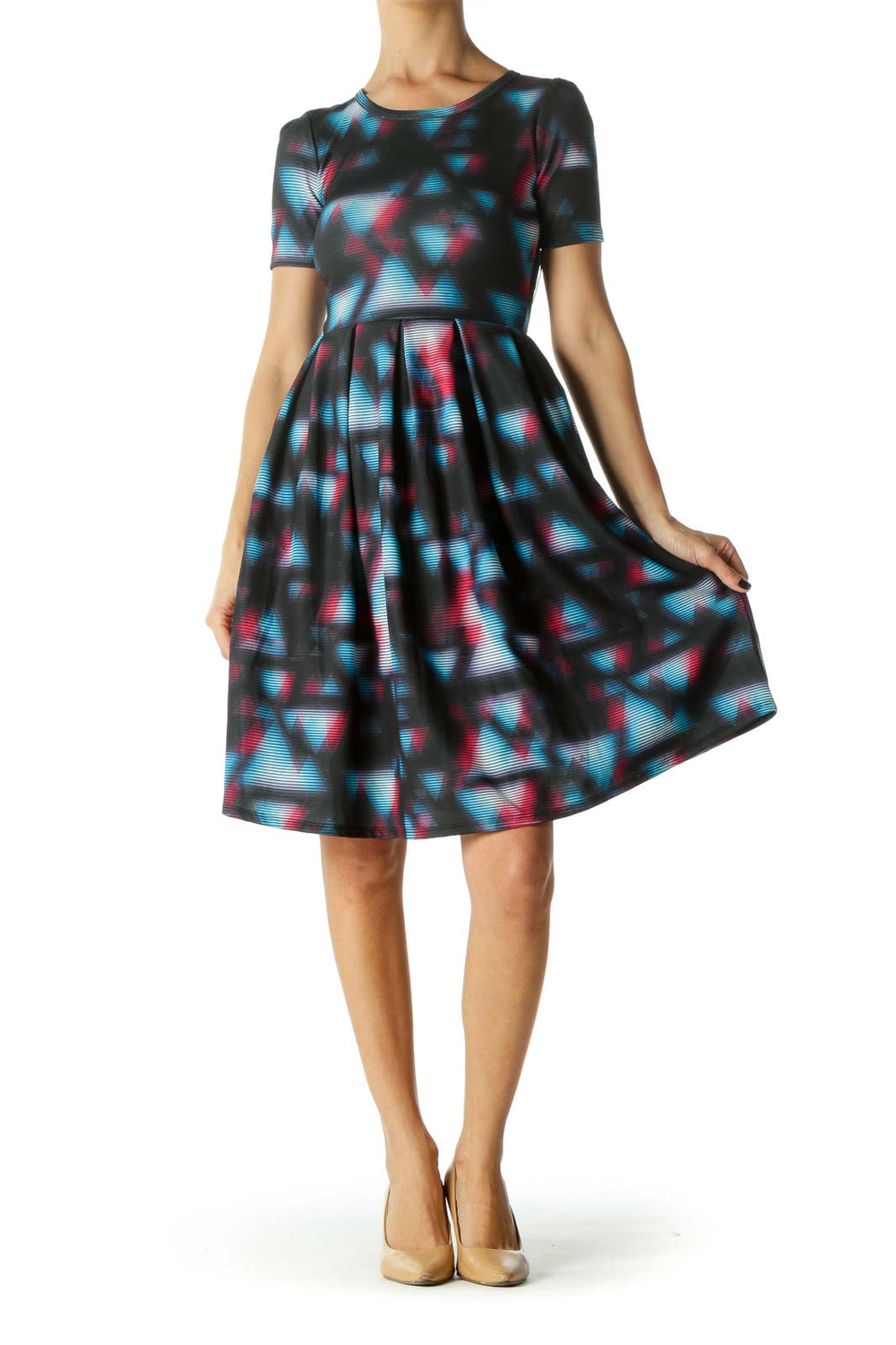 Black, Blue and Pink Geometric Print Round Neck, short Sleeve Day Dress