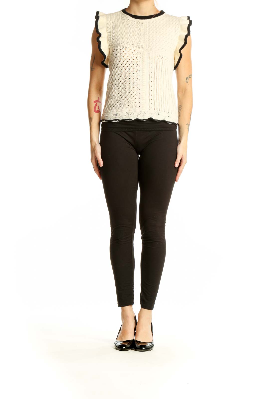 Elevate your casual wardrobe with this charming cream sleeveless knit top from Lumiere. Featuring an intricate mix of knit patterns, including cable, ribbed, and openwork designs, this top offers a delightful textural contrast. The ruffled armholes with black trim add a playful and feminine touch, perfect for a variety of occasions.