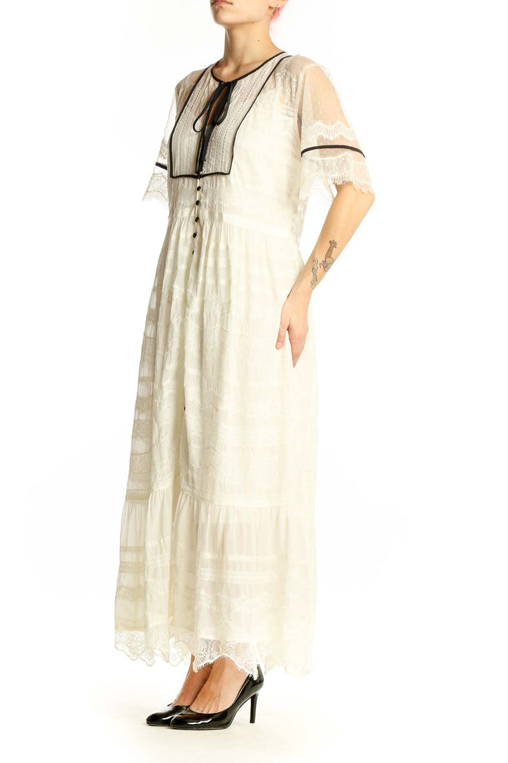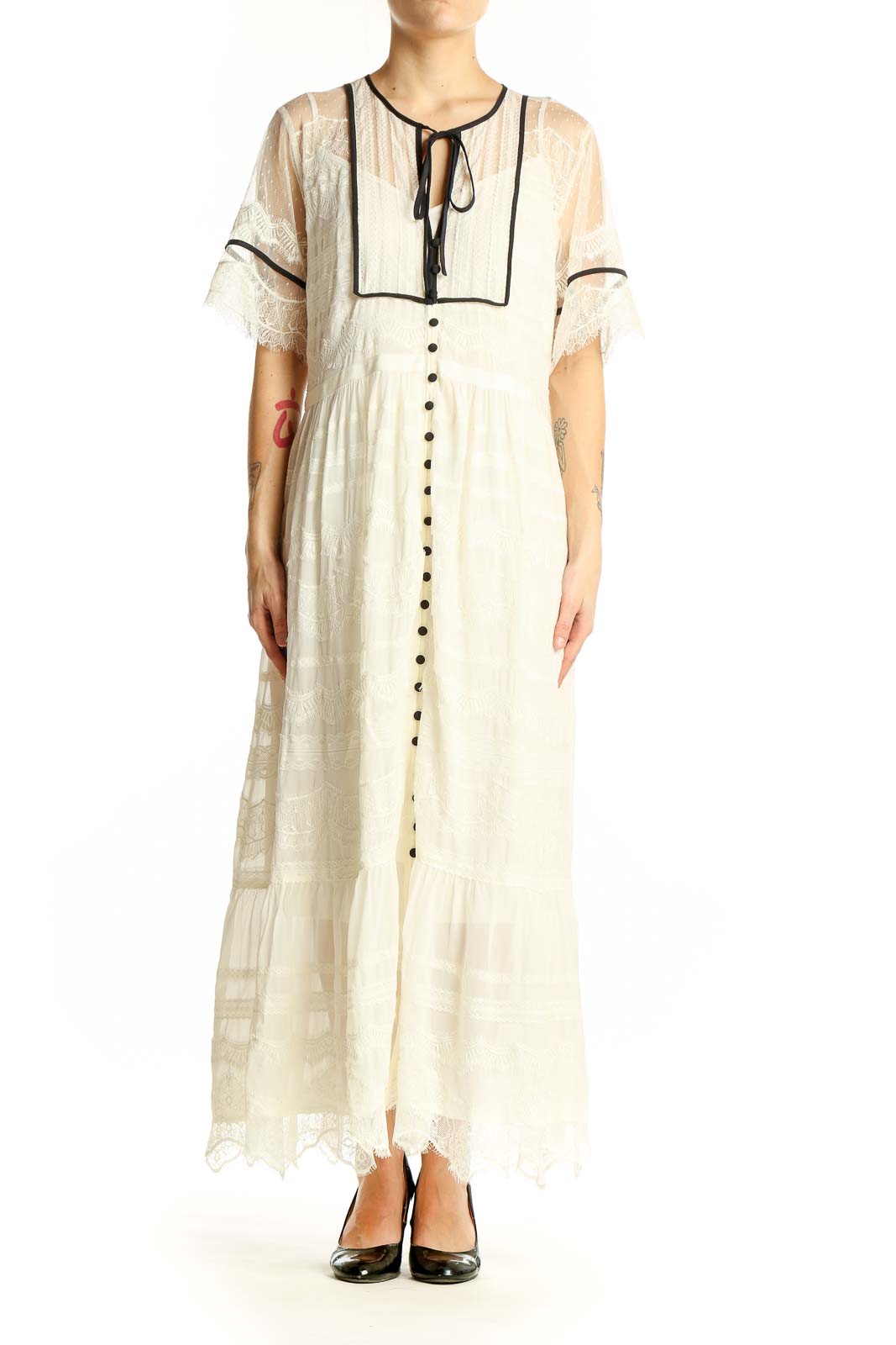Elevate your wardrobe with this stunning ivory maxi dress from Anthropologie. Crafted from a luxurious blend of polyamide, polyester, and viscose, this dress offers both comfort and elegance. The delicate lace trim adorning the short flutter sleeves and hemline adds a touch of romantic charm, while the button-down front provides a classic, versatile look.