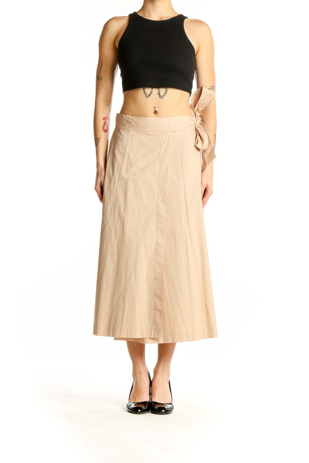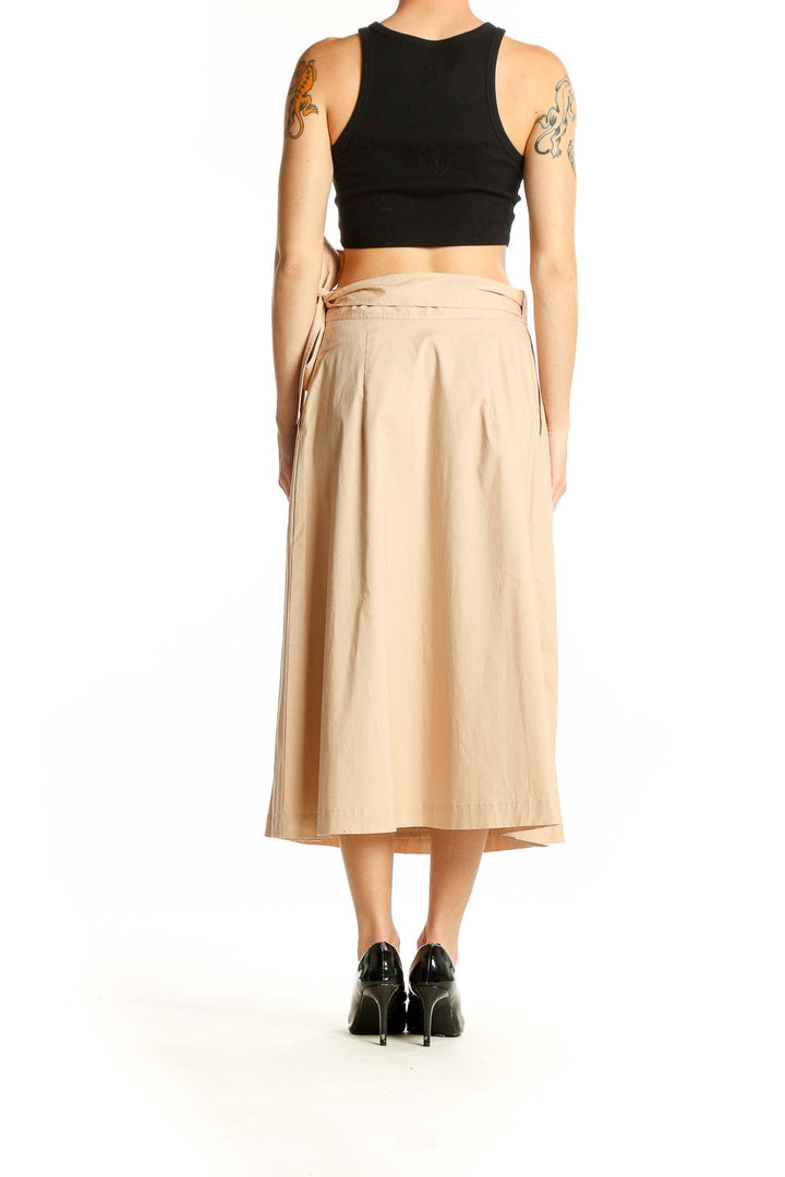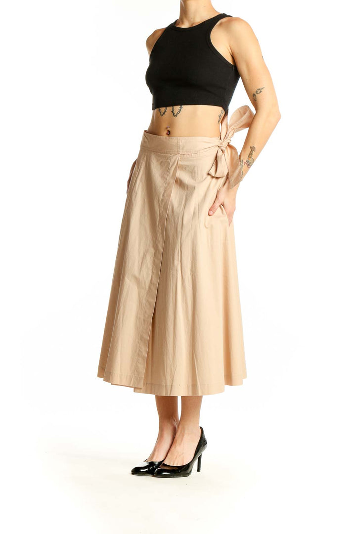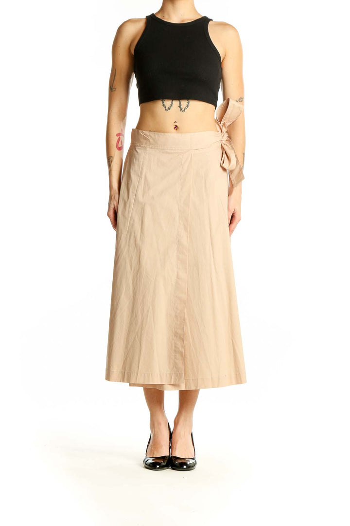 Elevate your wardrobe with this sophisticated beige midi skirt from Club Monaco. Crafted from a luxurious blend of cotton and elastane, this skirt offers both comfort and style. The wrap design features an elegant side tie, creating a flattering silhouette that's perfect for both casual and dressier occasions. With its versatile length hitting mid-calf, this skirt is a wardrobe staple that can be dressed up or down. The excellent condition of this piece ensures you'll look polished and put-together every time you wear it. Its neutral beige color makes it easy to pair with a variety of tops and accessories, allowing for endless styling possibilities. The subtle texture of the fabric adds depth to the overall look, while the side tie detail adds a touch of feminine charm. Whether you're heading to the office or out for brunch, this Club Monaco skirt is sure to become a go-to favorite in your collection.