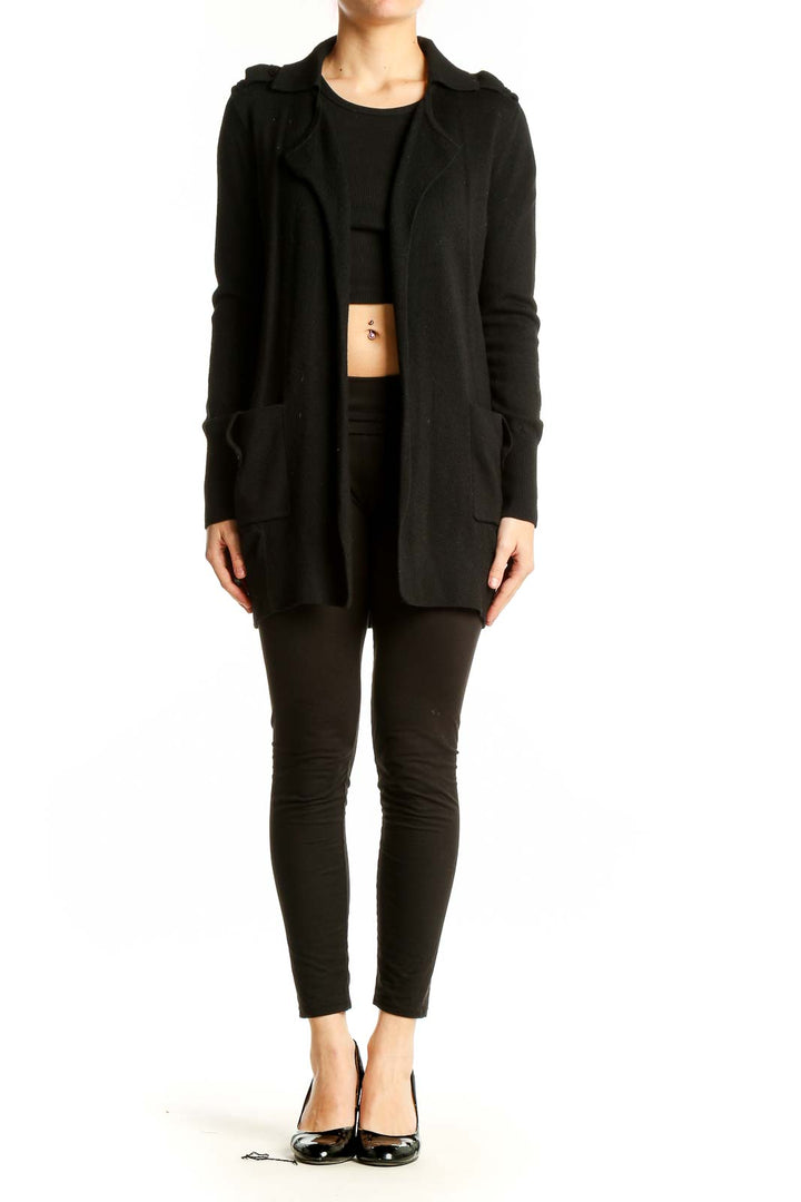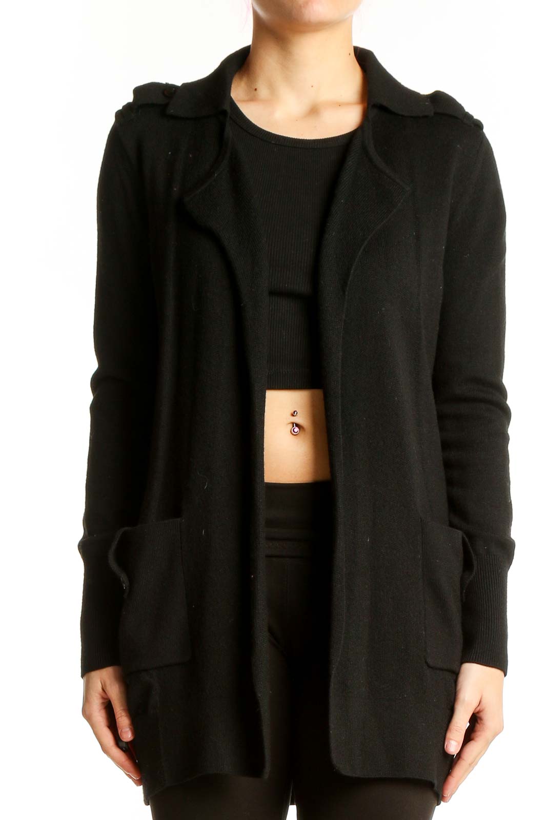 Elevate your wardrobe with this sophisticated black Merino wool long cardigan from Banana Republic. Perfect for layering, this versatile piece offers both style and comfort. The soft, luxurious Merino wool fabric provides warmth without bulk, making it ideal for year-round wear. Features include a classic collar, front pockets, and a relaxed fit that drapes beautifully. The excellent condition of this XS-sized cardigan ensures you'll enjoy its timeless elegance for years to come. With its sleek silhouette and high-quality construction, this cardigan effortlessly transitions from office to evening, making it a must-have addition to any fashion-forward wardrobe.