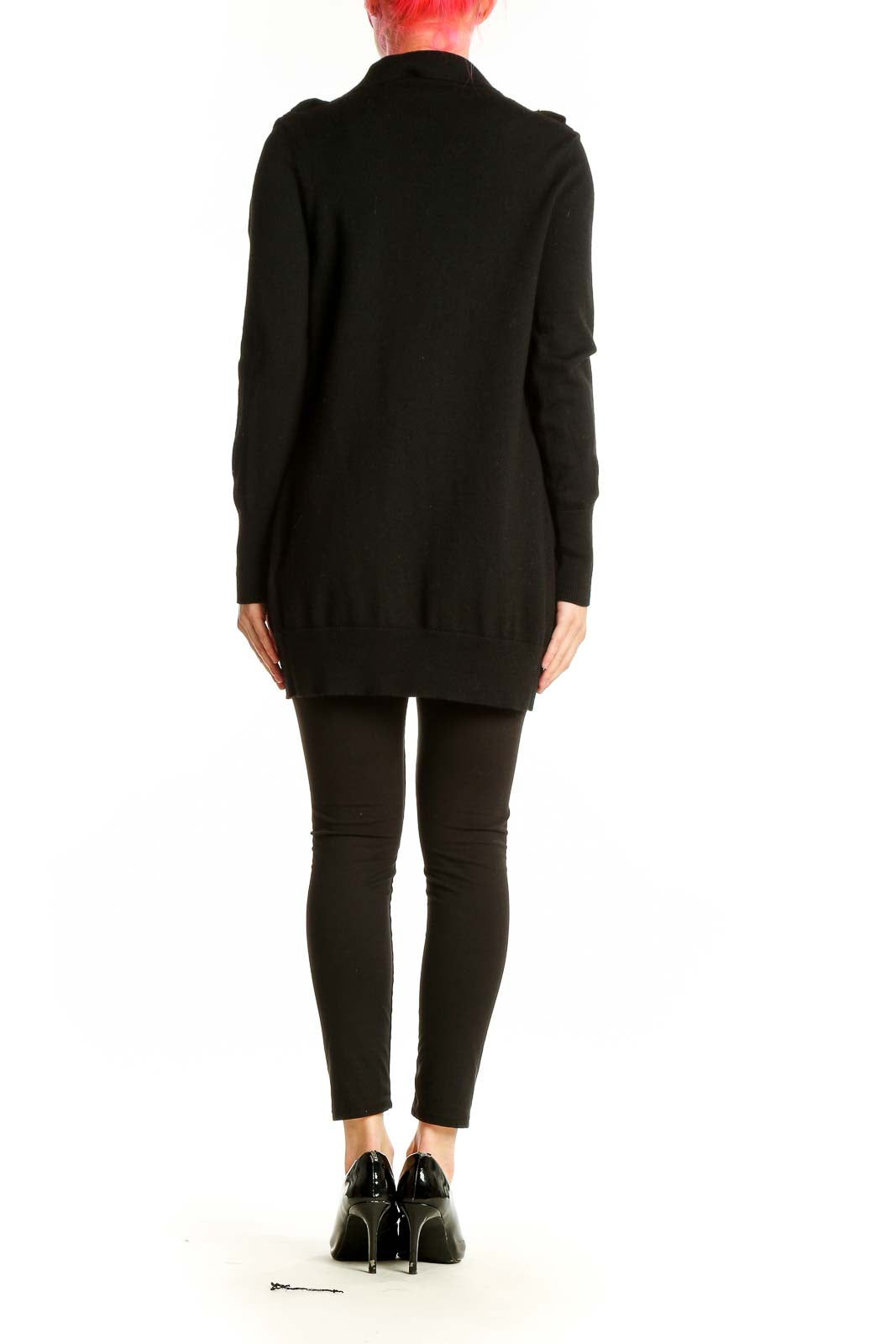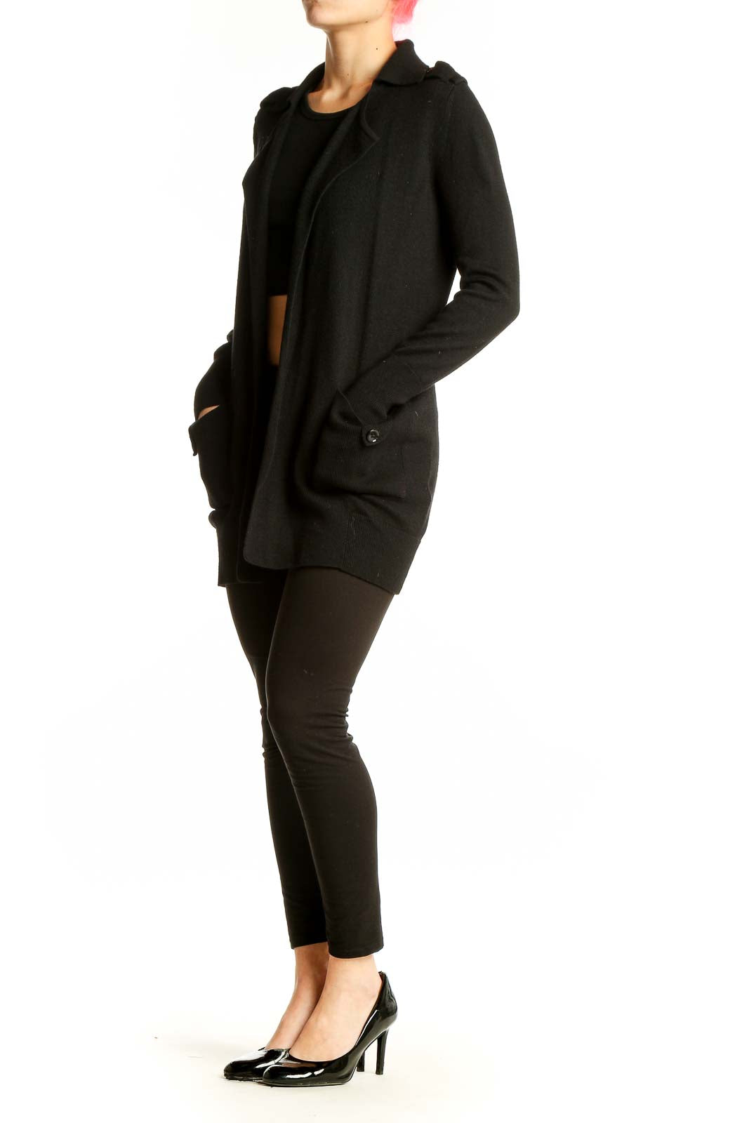 Side view of model wearing Banana Republic black Merino wool long cardigan