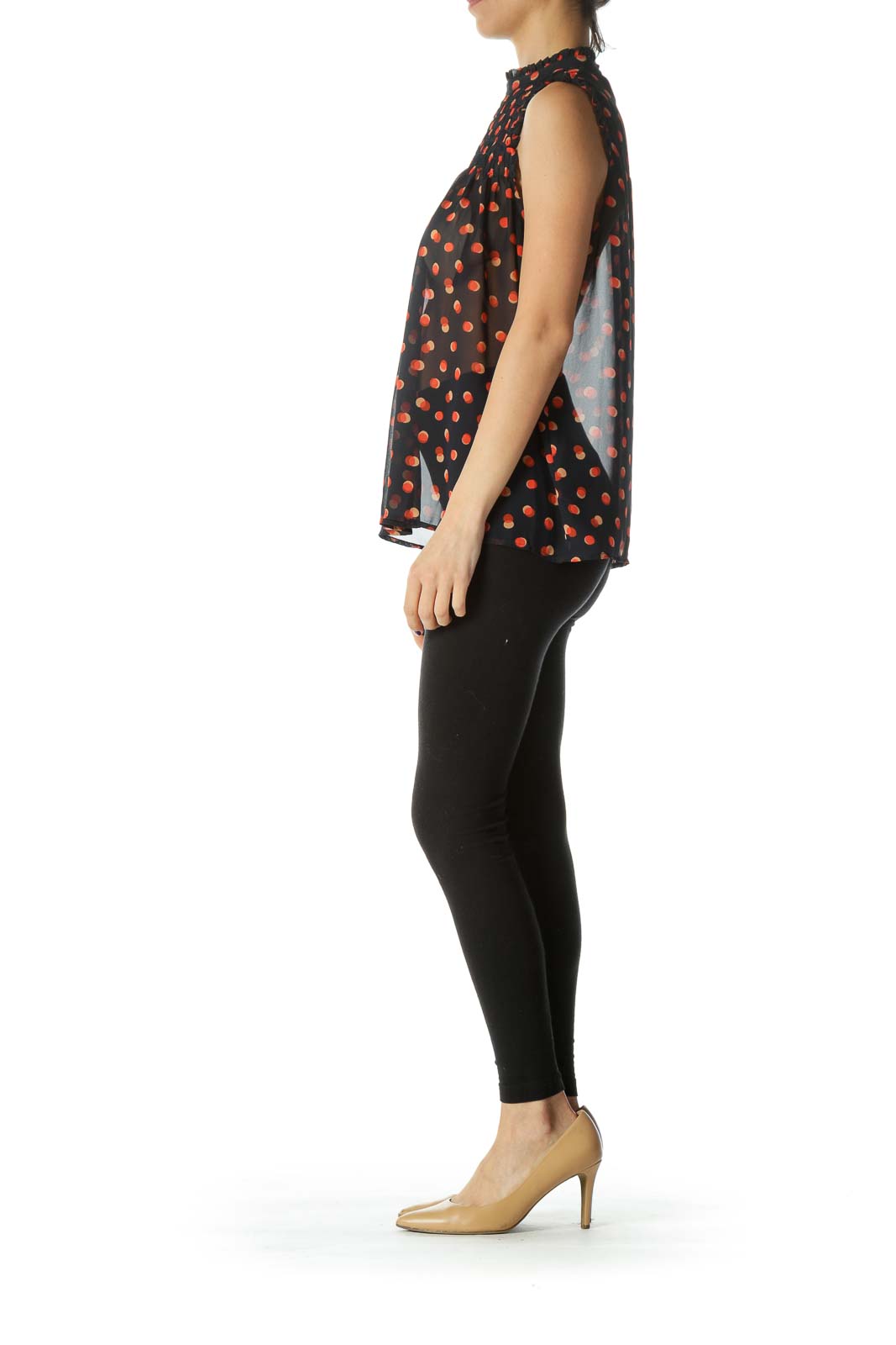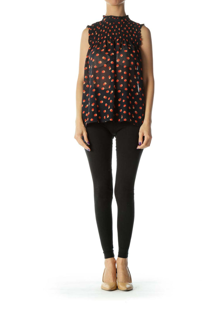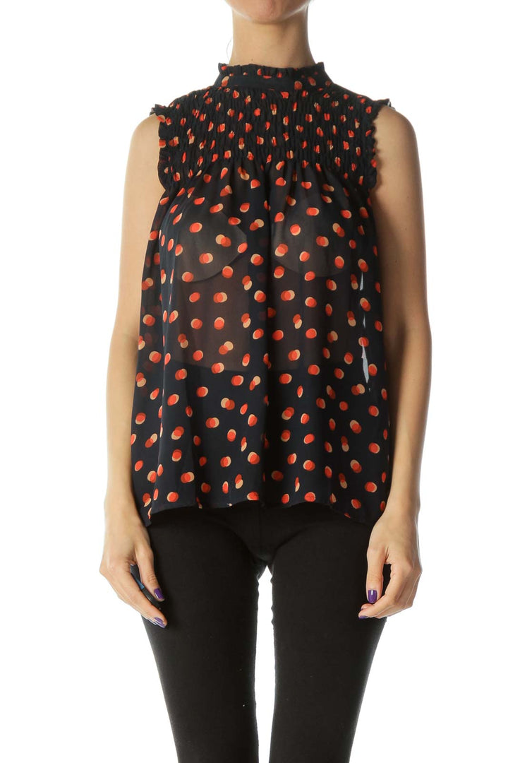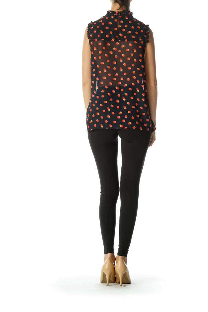 Navy & Orange Polka-Dotted Ruffled High-Neck Sleeveless Translucent Blouse