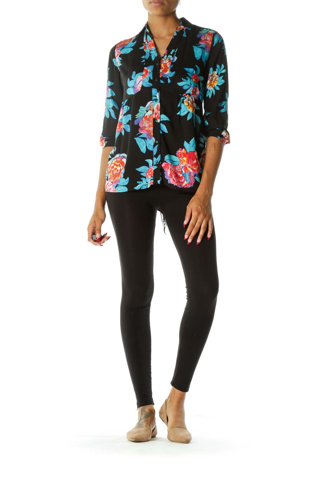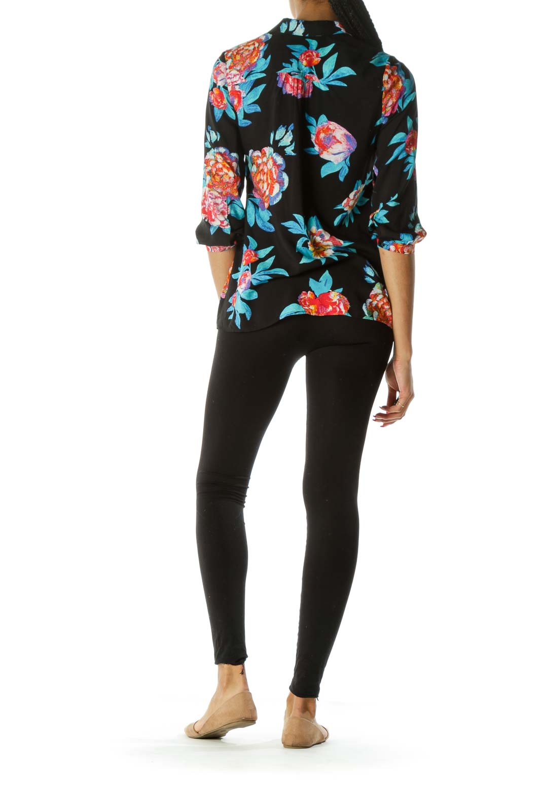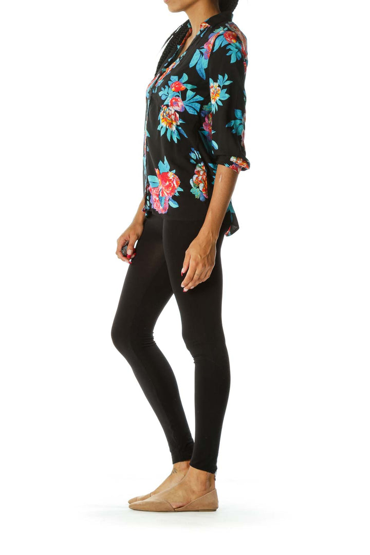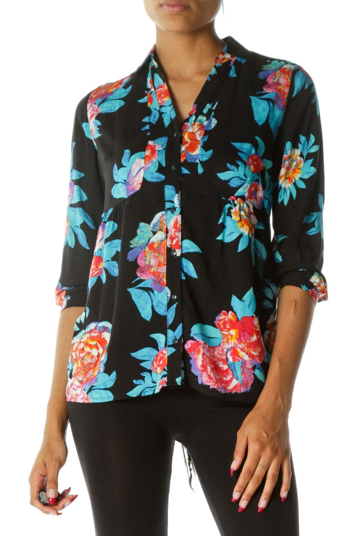 Black Blue & Orange Floral Short-Sleeve Button-Down Blouse