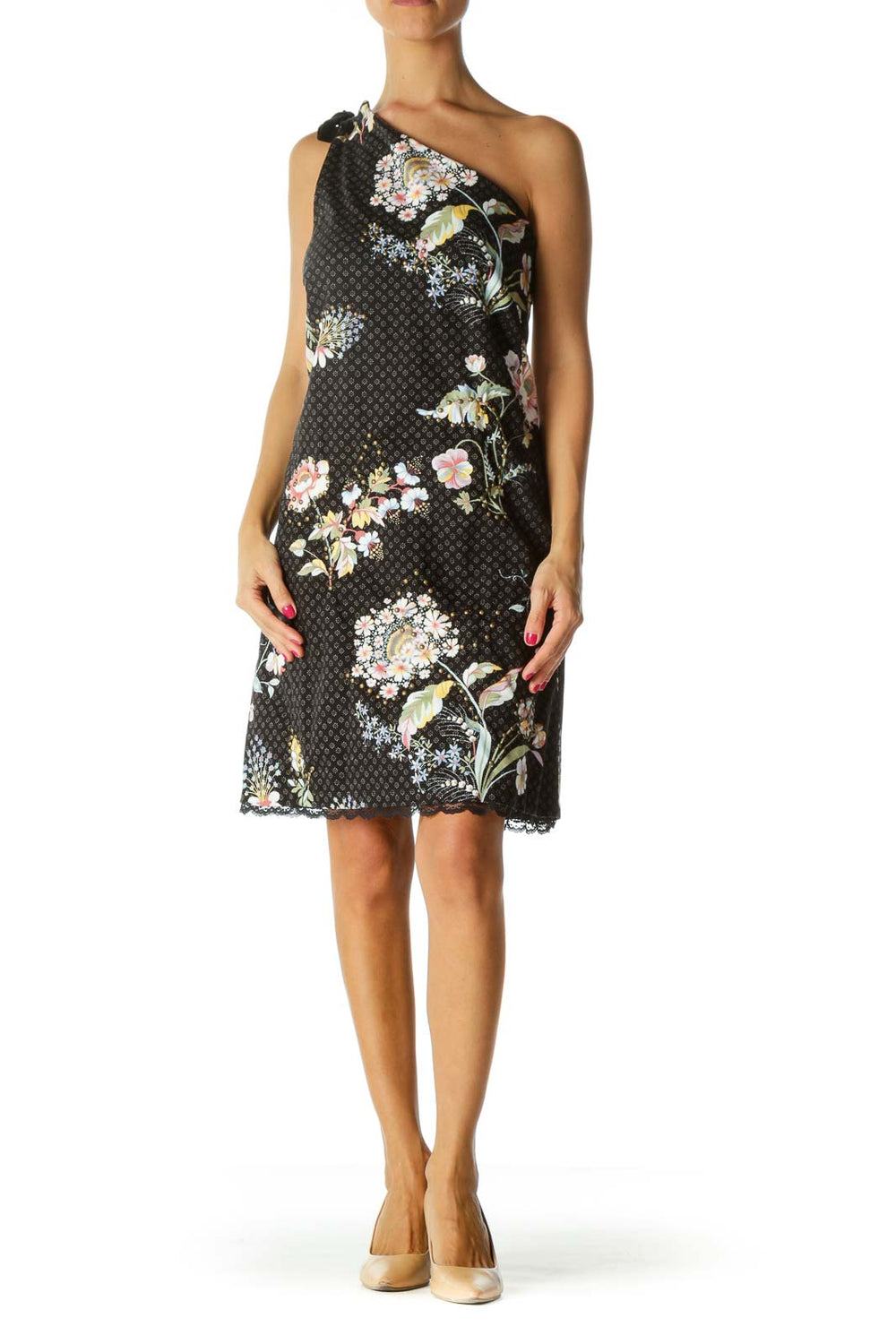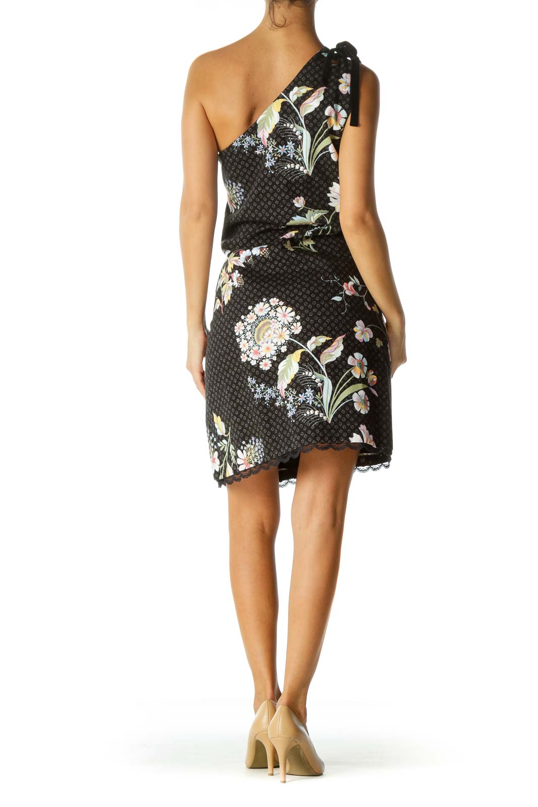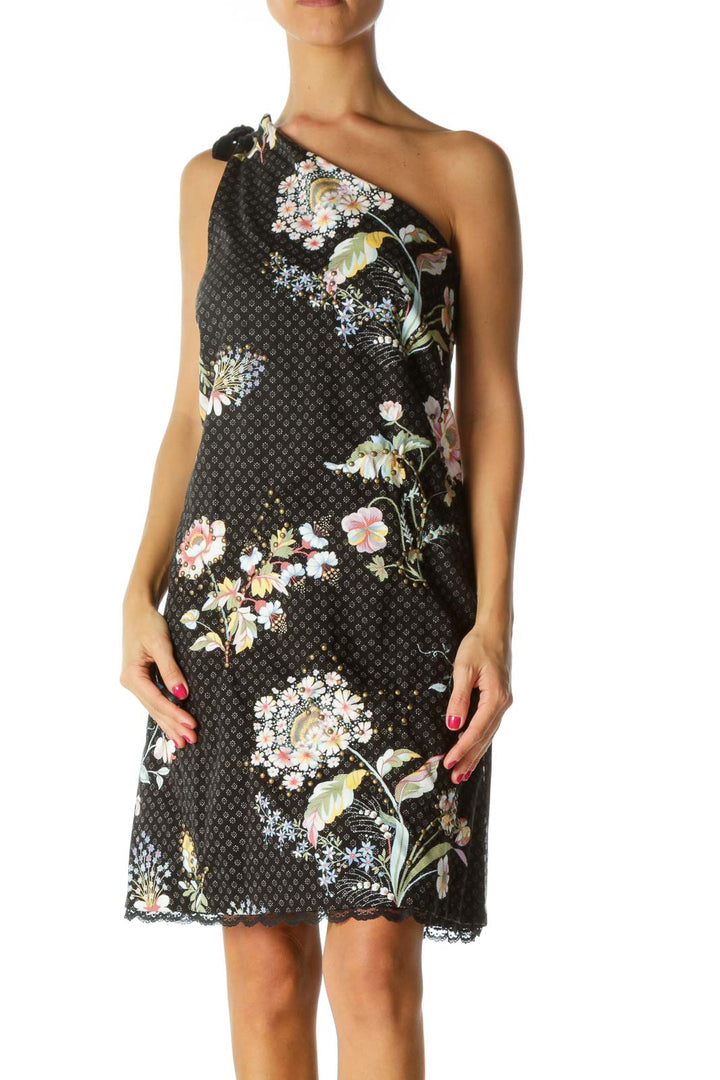 Black Multicolored-Floral Print Studded Velvet Shoulder Knot Textured Dress