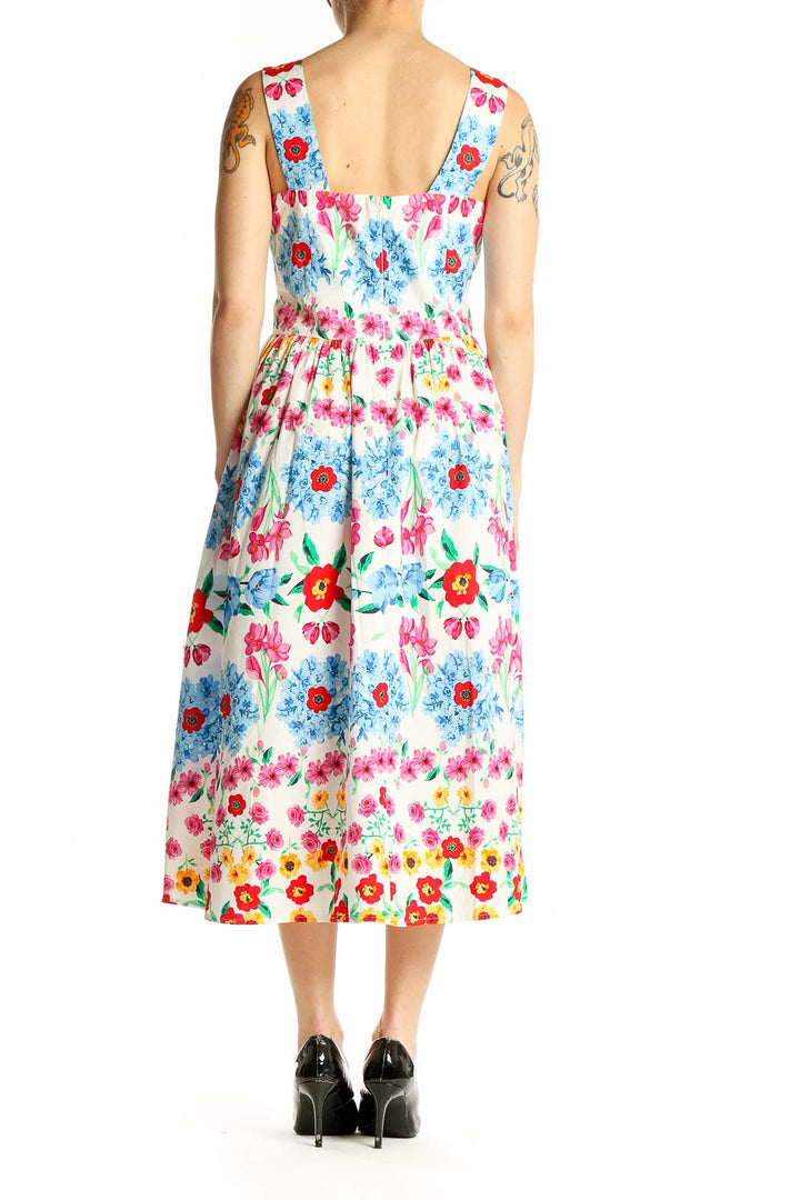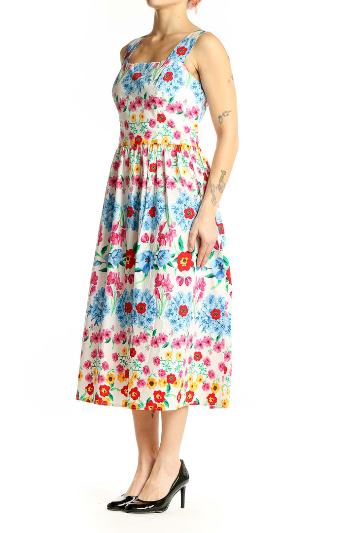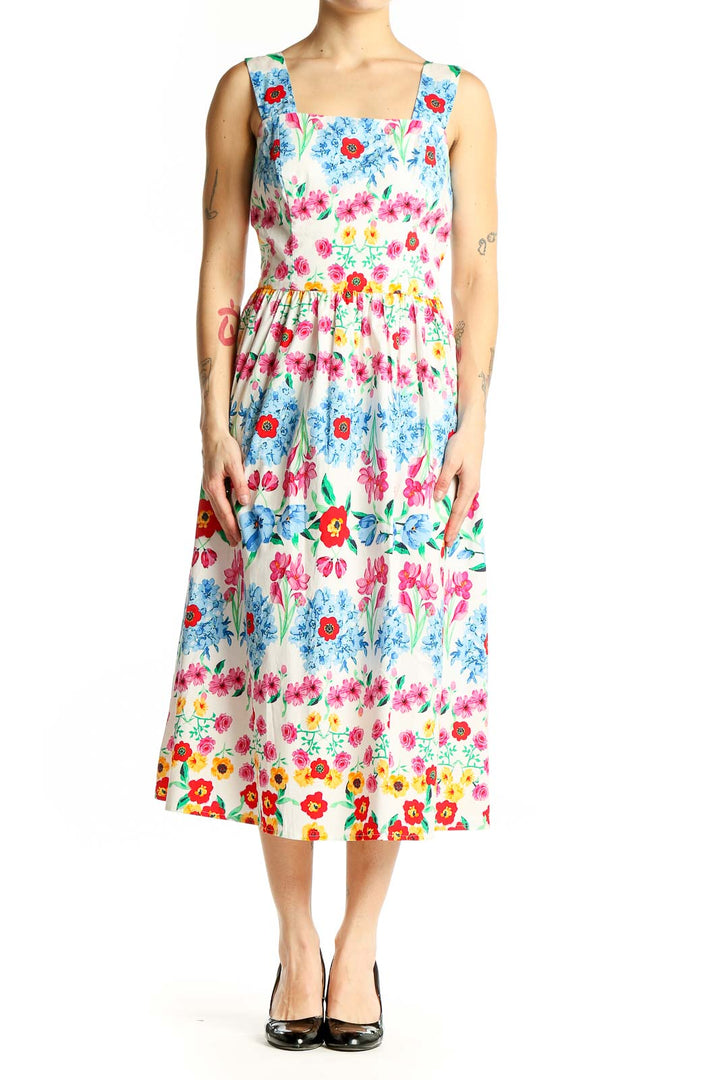 Step into a garden of vibrant beauty with this stunning multicolor floral print midi dress from Maggy London. This eye-catching piece features a delightful array of colorful blooms, including blue, pink, red, and yellow flowers, set against a crisp white background. The sleeveless design and square neckline offer a flattering silhouette, perfect for warm weather occasions.