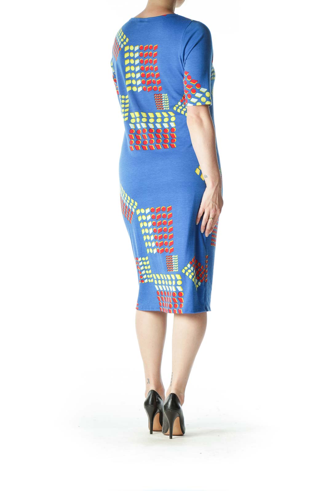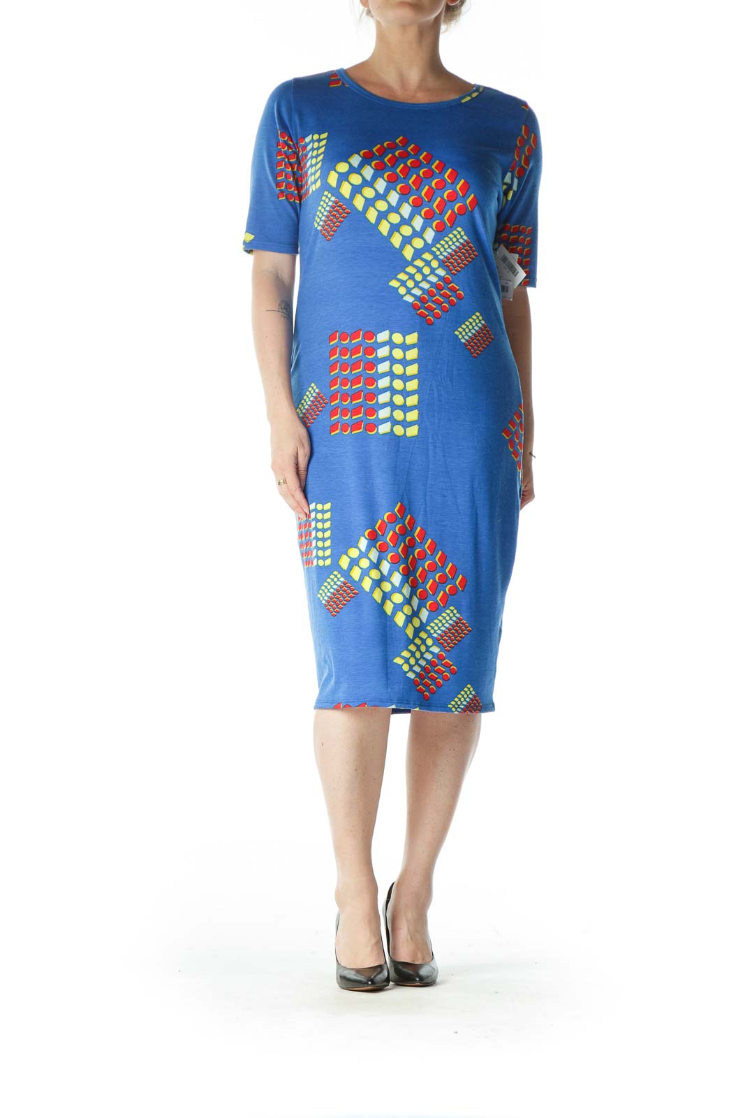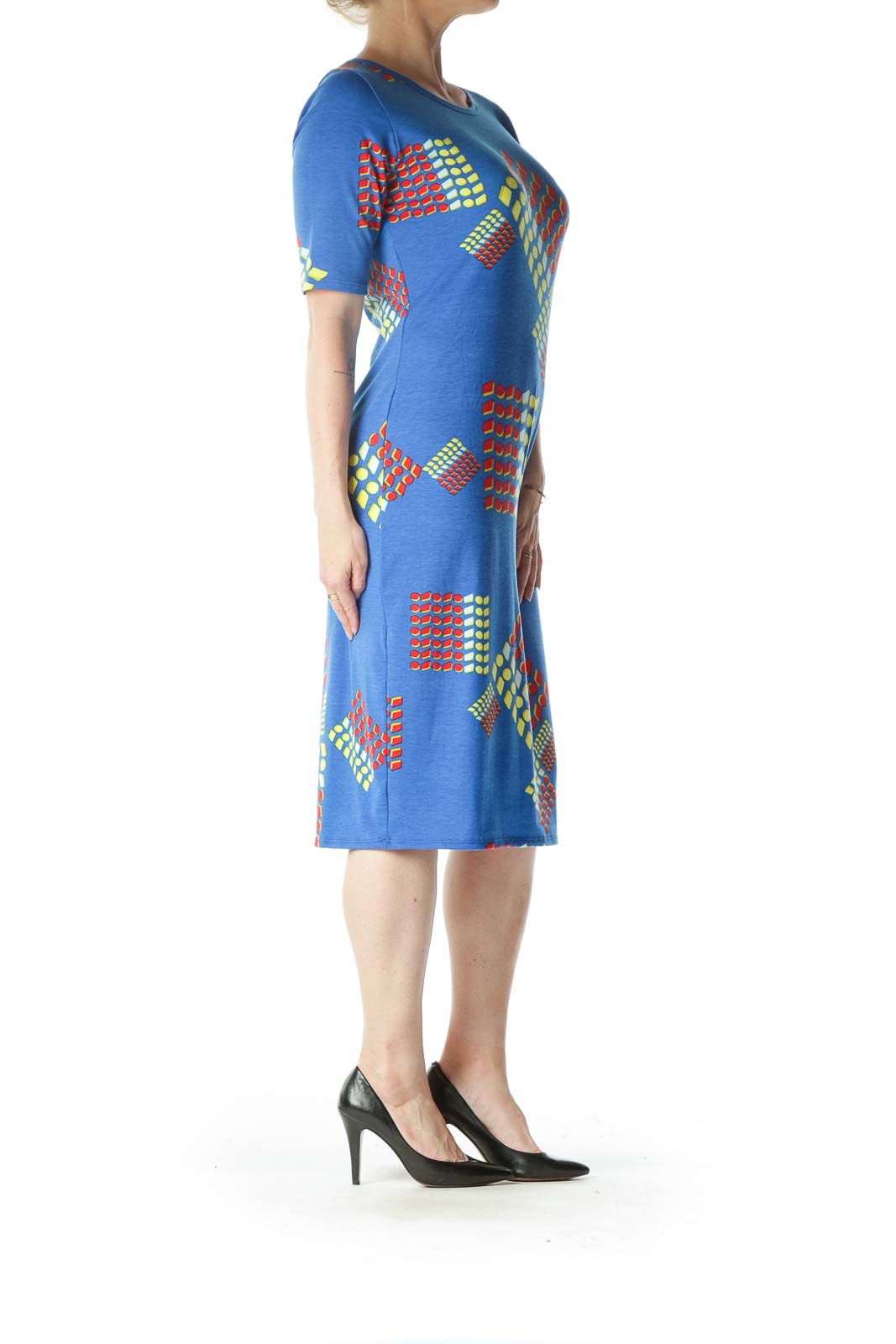 Blue and Yellow Patterned Midi T-Shirt Dress