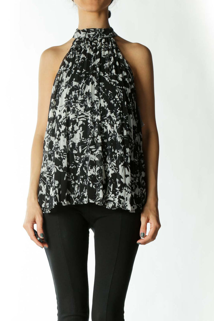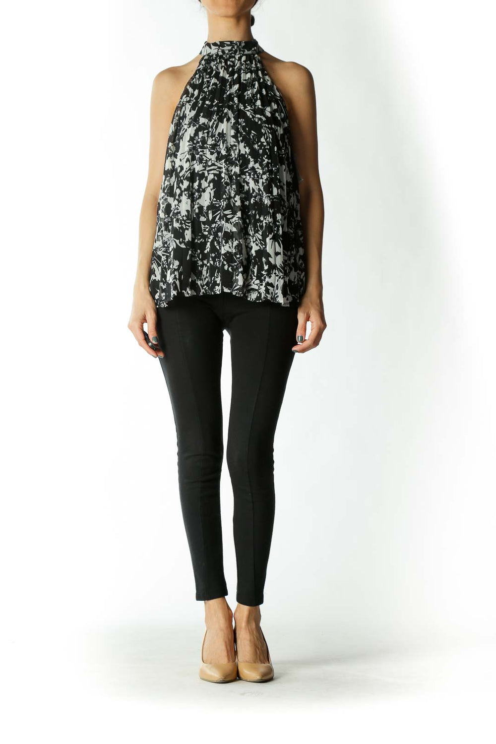 Black and White Printed High-Neck Sleeveless Pleated Blouse