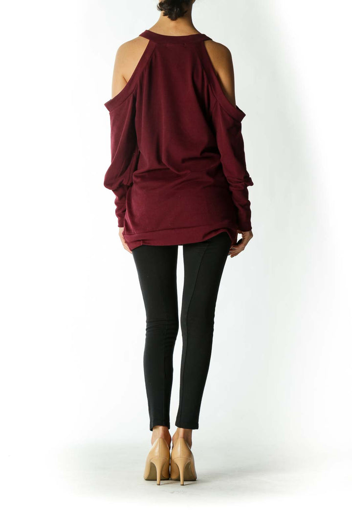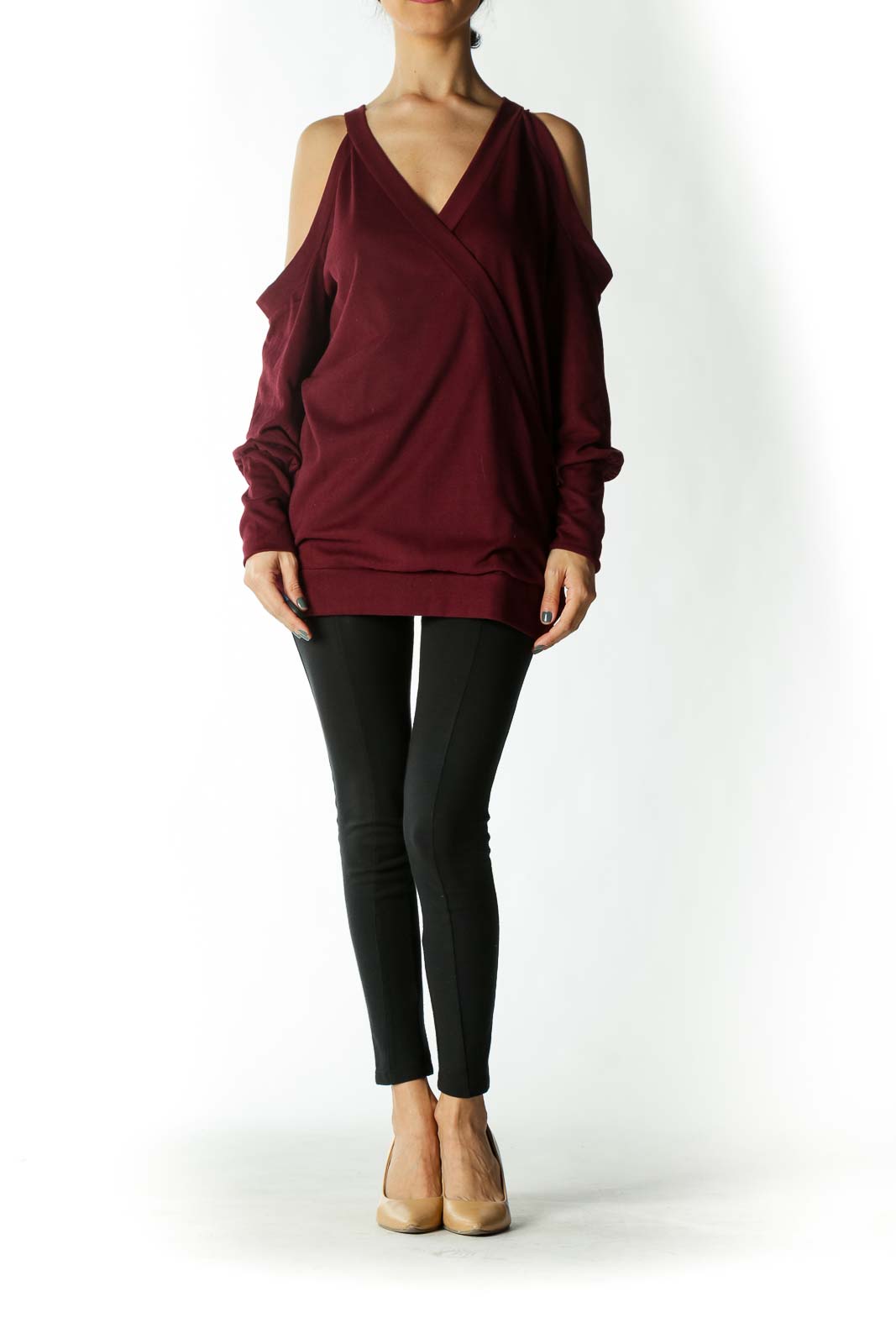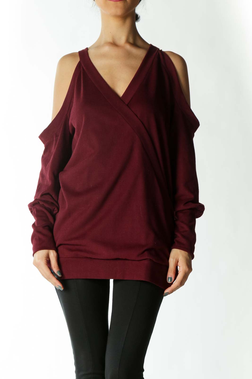 Burgundy Cross-Front Cold-Shoulder V-Neck Long-Sleeve Knit