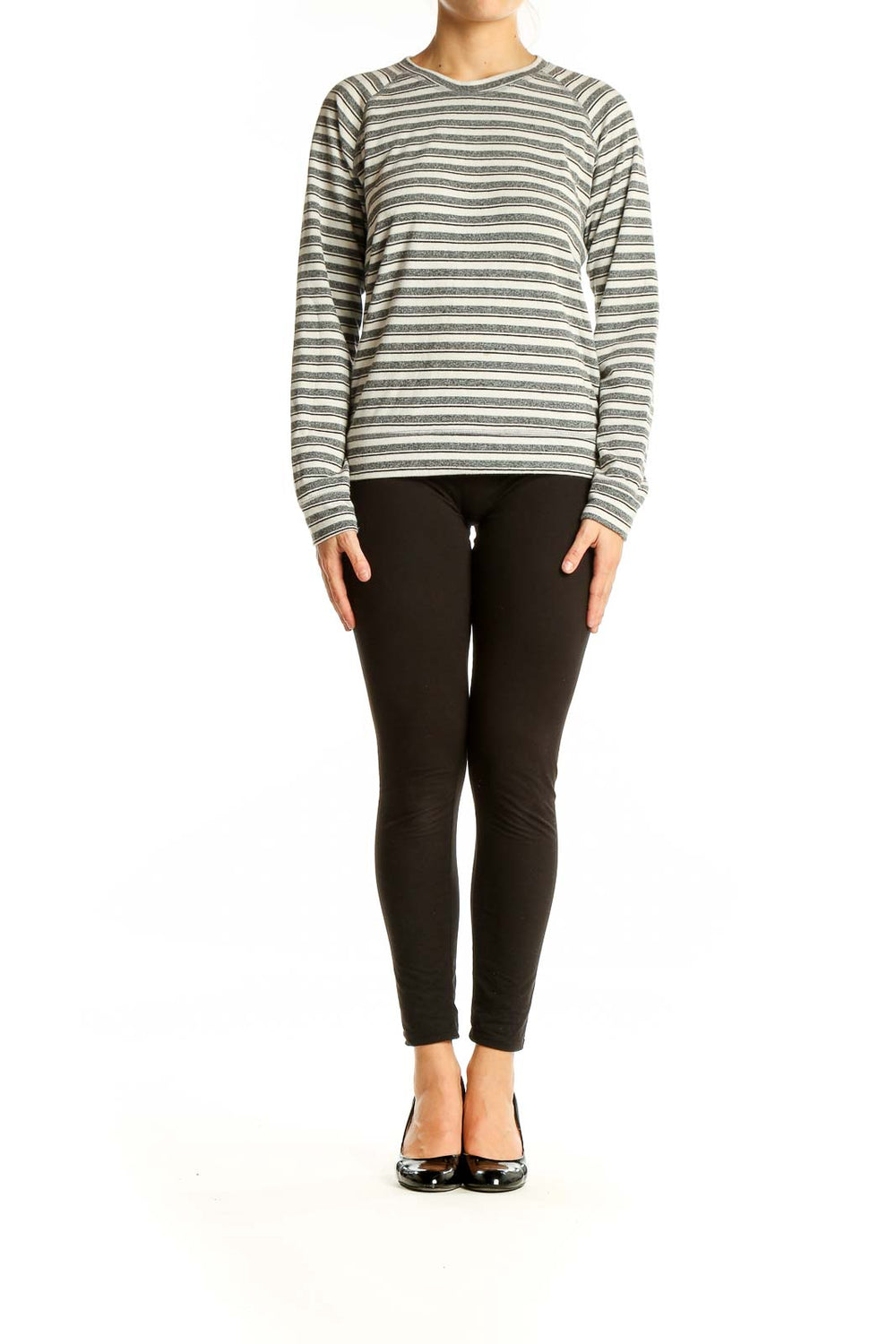 Elevate your casual wardrobe with this chic gray and white striped long sleeve top from Marine Layer. Crafted from a soft, comfortable knit fabric, this versatile piece offers both style and comfort for everyday wear. The classic crew neckline and raglan sleeves provide a relaxed fit, perfect for layering or wearing on its own.