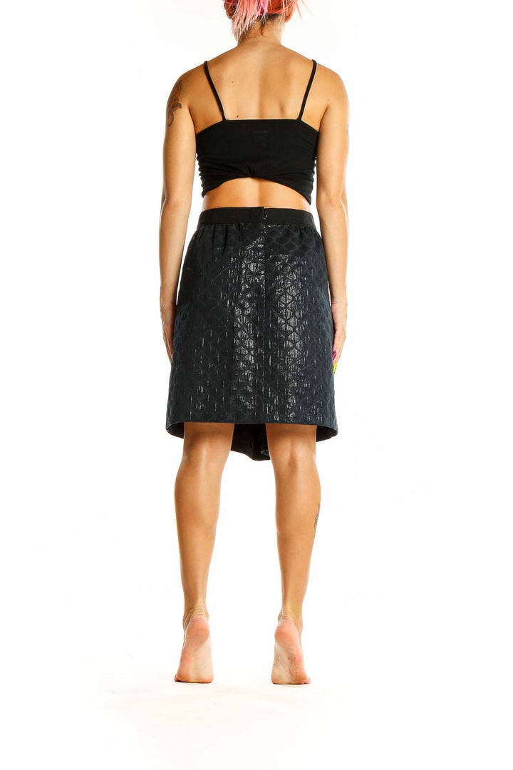 The elastic waistband ensures a comfortable fit, while the A-line silhouette flatters various body types. The skirt falls to a versatile knee length, making it perfect for both office wear and evening outings. The metallic sheen subtly catches the light, creating a sophisticated and eye-catching effect.
