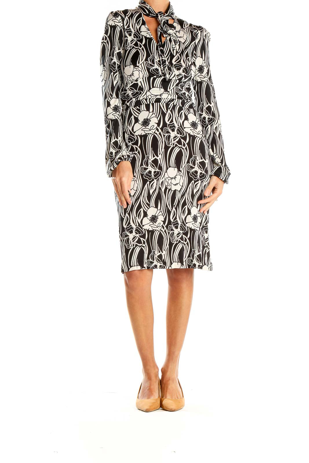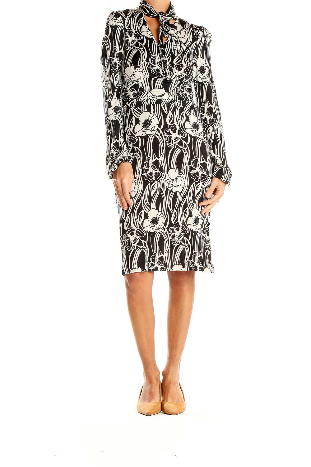 Designed with a flattering fit, this dress showcases a high neckline with a chic tie detail, adding a touch of feminine charm. The long sleeves and knee-length cut make it versatile for various occasions, from office wear to evening events. The excellent condition of this piece ensures you'll look polished and put-together.