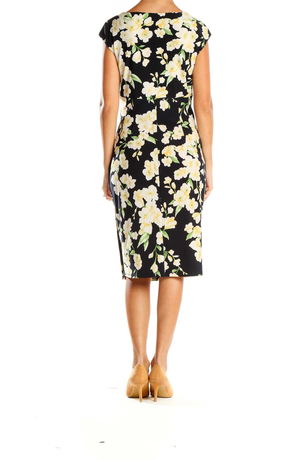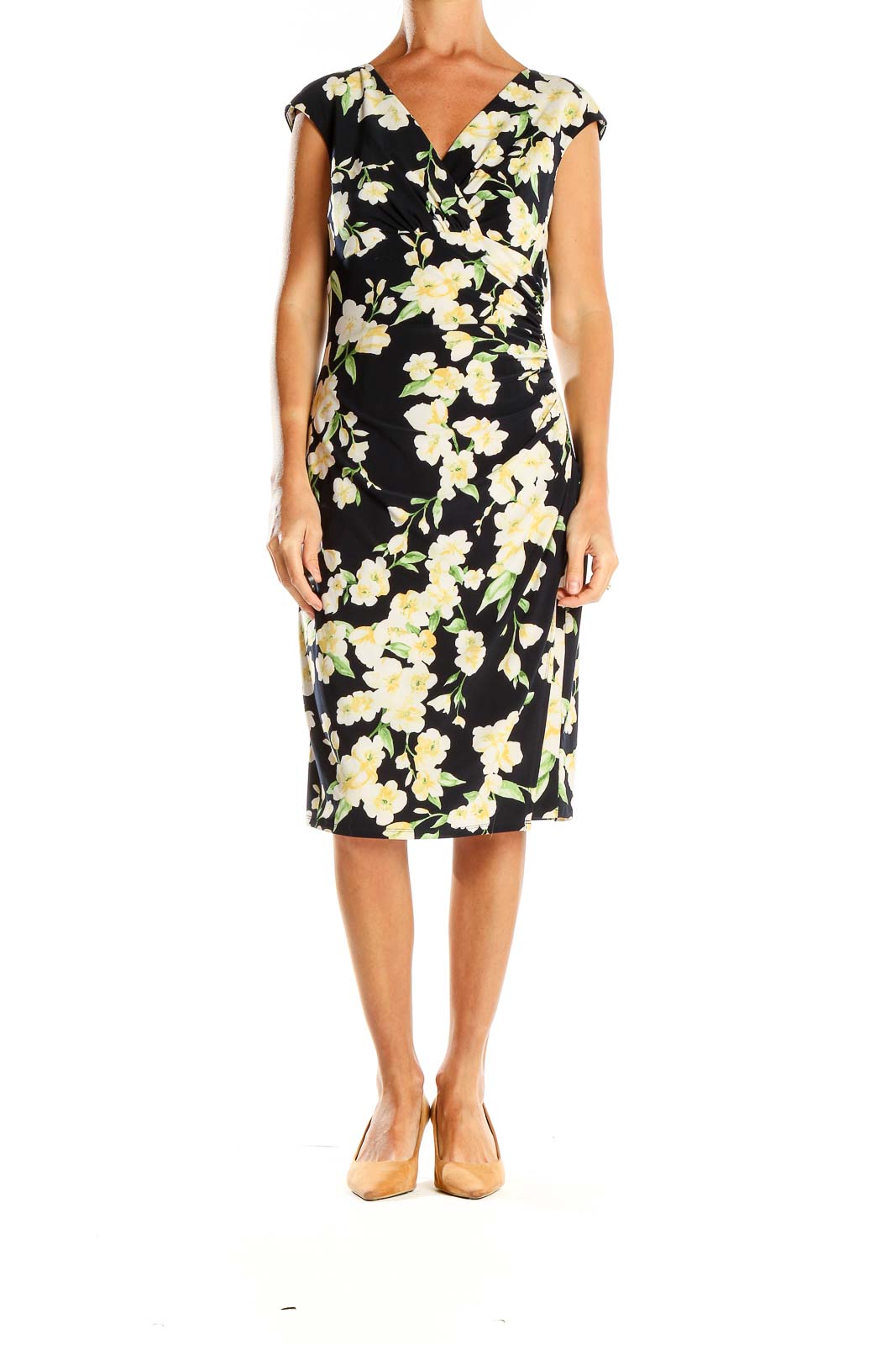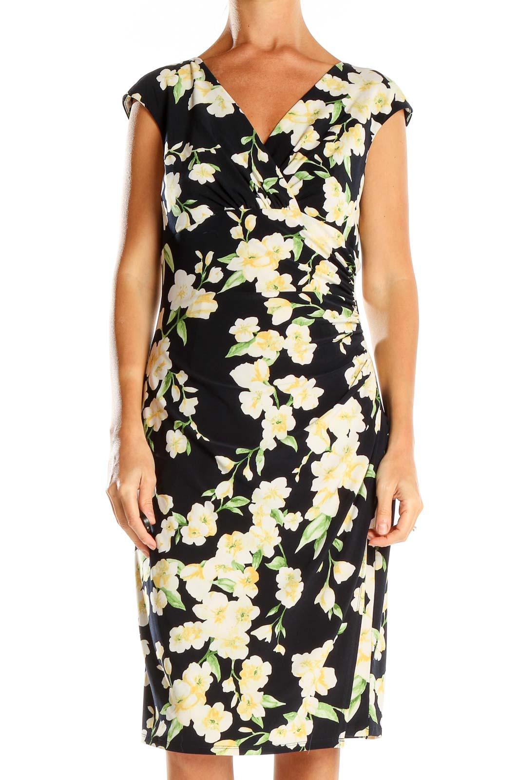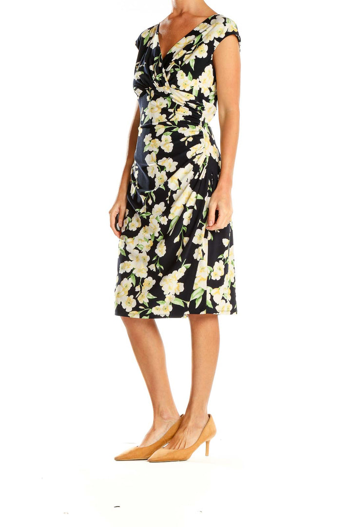 Elevate your wardrobe with this stunning black floral midi dress from Lauren Ralph Lauren. The elegant wrap-style silhouette features a flattering V-neckline and cap sleeves, perfect for both day and evening occasions. The dress showcases a beautiful yellow and white floral print against a rich black background, creating a sophisticated and feminine look.