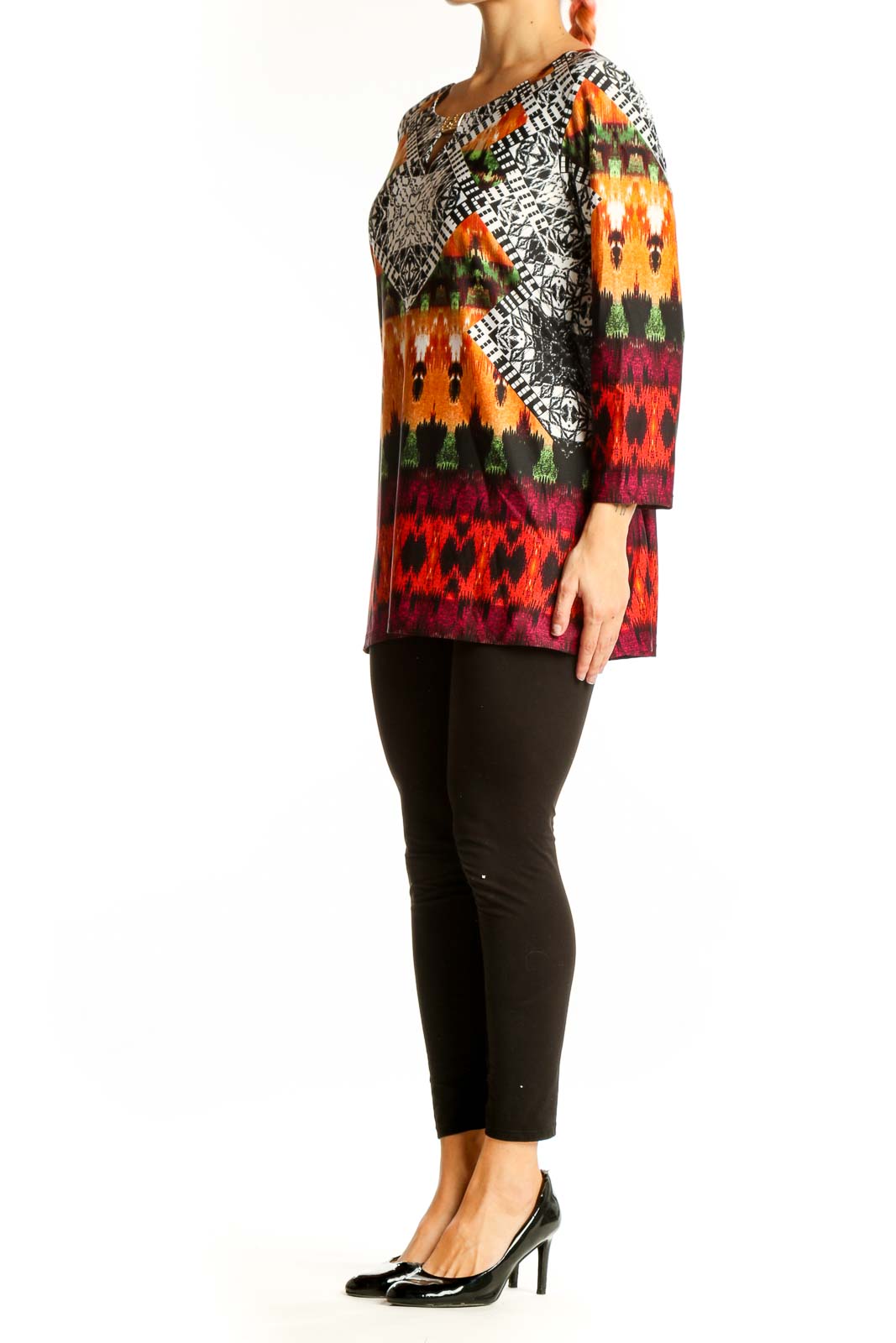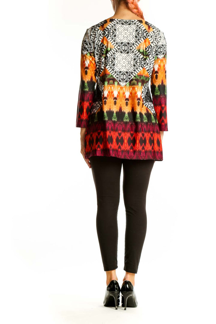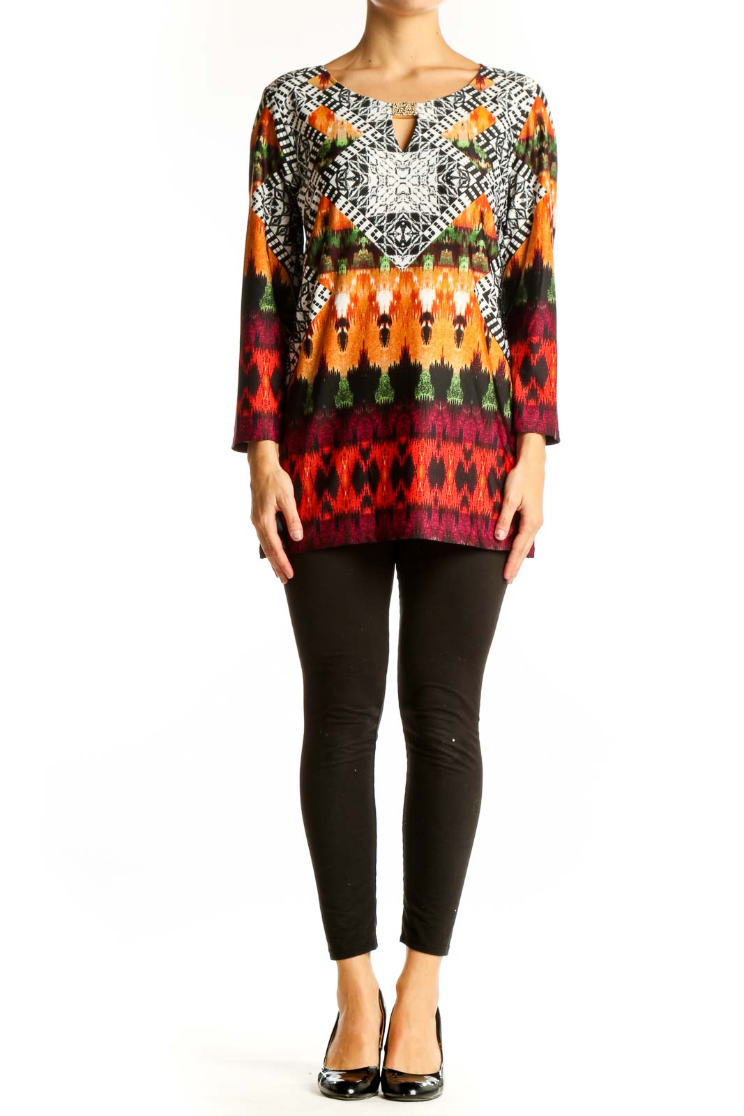 Make a bold statement with this eye-catching Melissa Paige tunic top. Featuring a vibrant multicolor geometric print, this top combines comfort and style effortlessly. The intricate pattern showcases a mix of black and white geometric designs alongside warm orange, green, and burgundy hues, creating a striking visual impact.