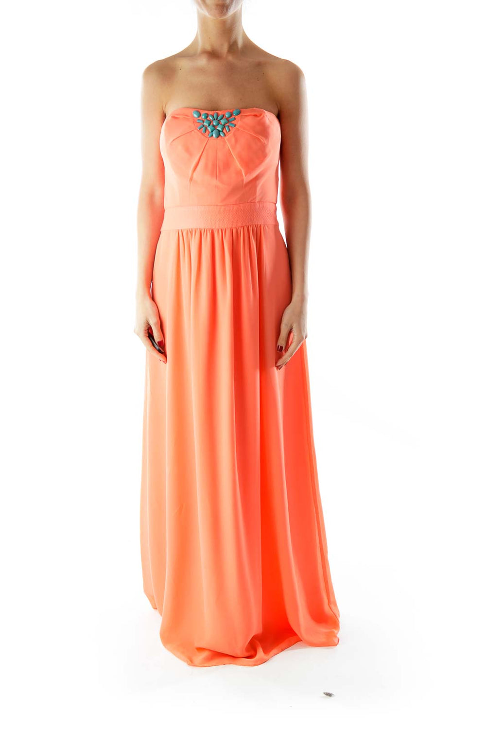 Teal Beaded Strapless Orange Floor length Dress