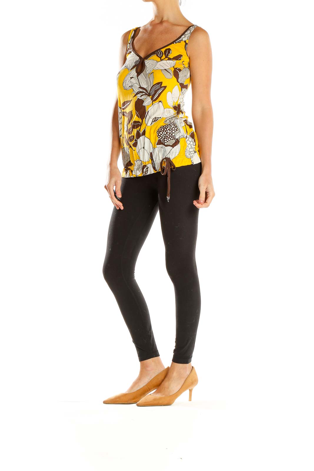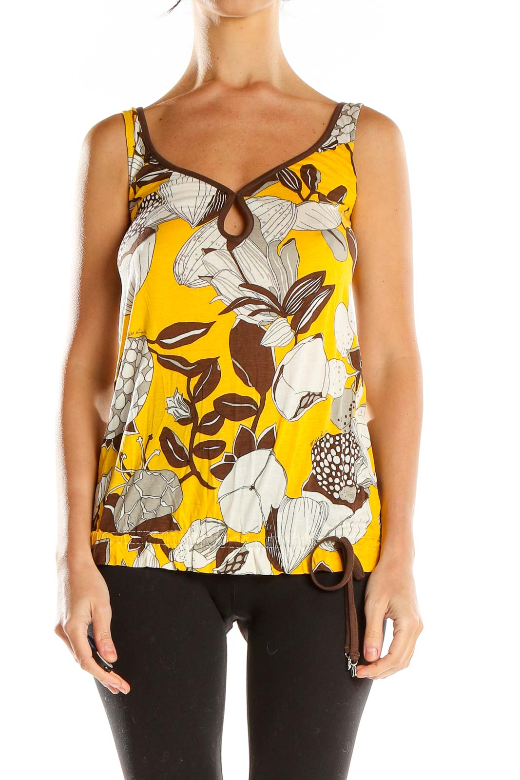 Make a bold statement with this vibrant yellow sleeveless top from Miss Sixty. Featuring an eye-catching floral print in white and brown hues, this top is perfect for adding a pop of color to your summer wardrobe. The lightweight fabric drapes beautifully, creating a flattering silhouette that's both comfortable and stylish.
