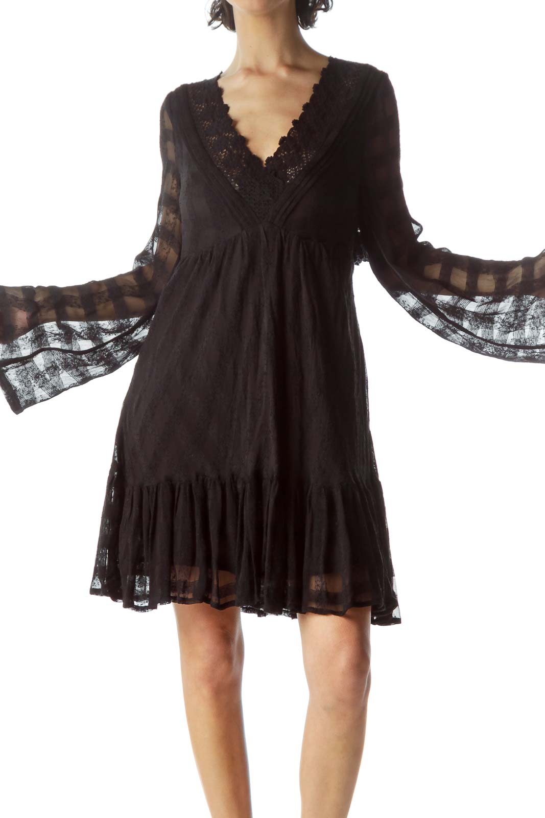 Elevate your style with this enchanting black lace mini dress from Free People. Featuring a flattering V-neckline adorned with delicate scalloped lace trim, this dress exudes bohemian charm and feminine allure. The bell sleeves add a touch of drama and movement, while the sheer lace overlay creates a captivating play of textures.