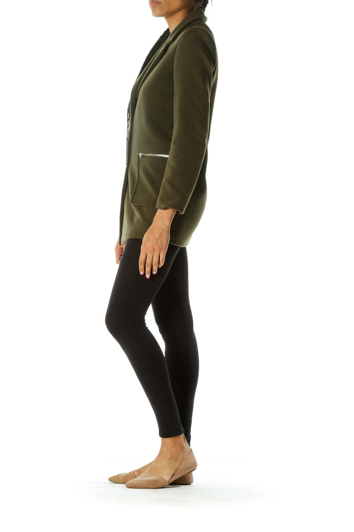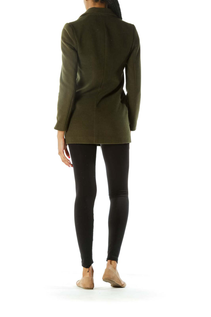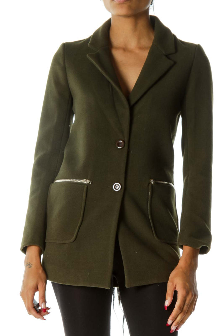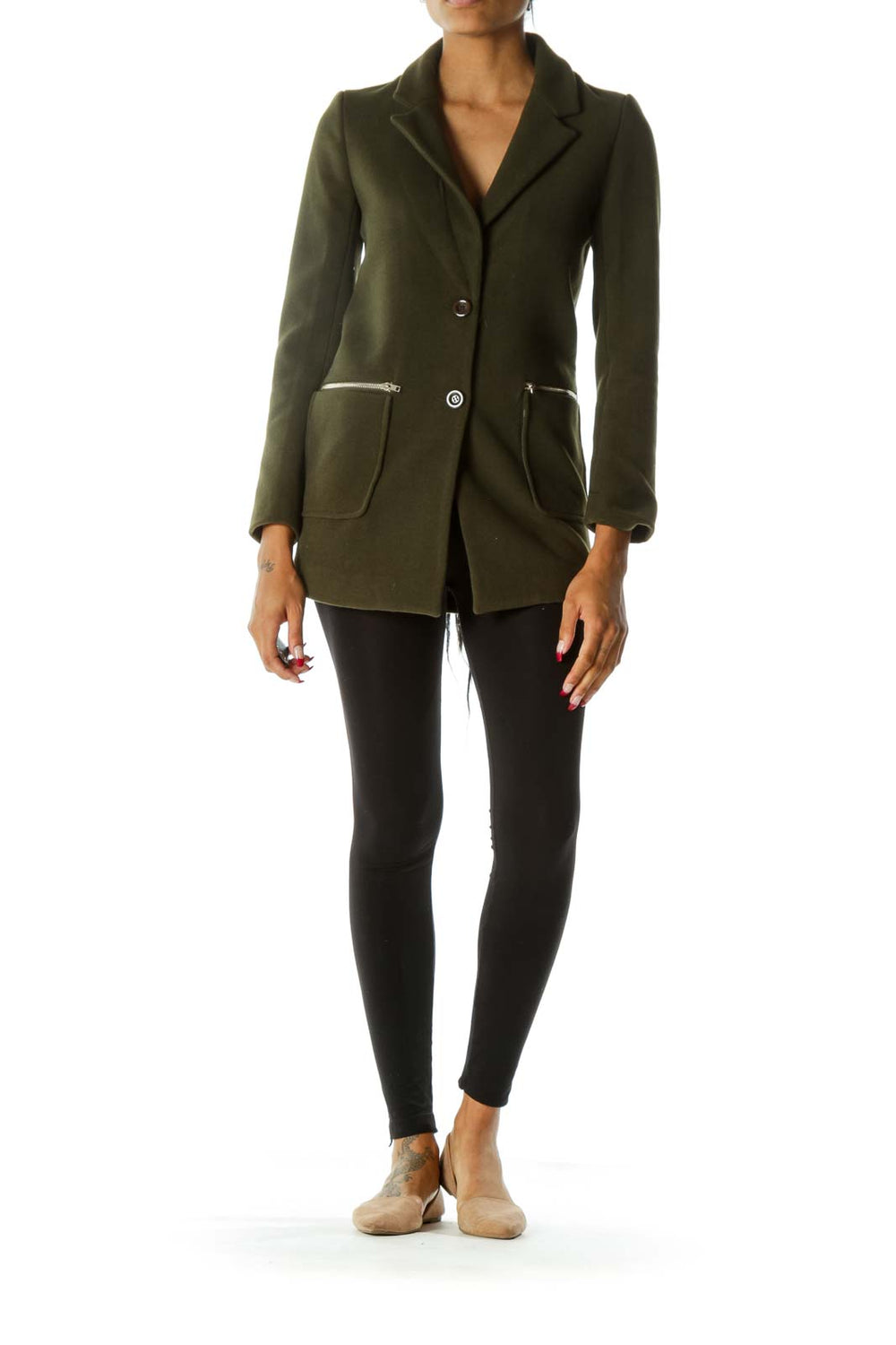 Green V-Neck Zippers Pocketed Buttoned Long Sleeve Coat
