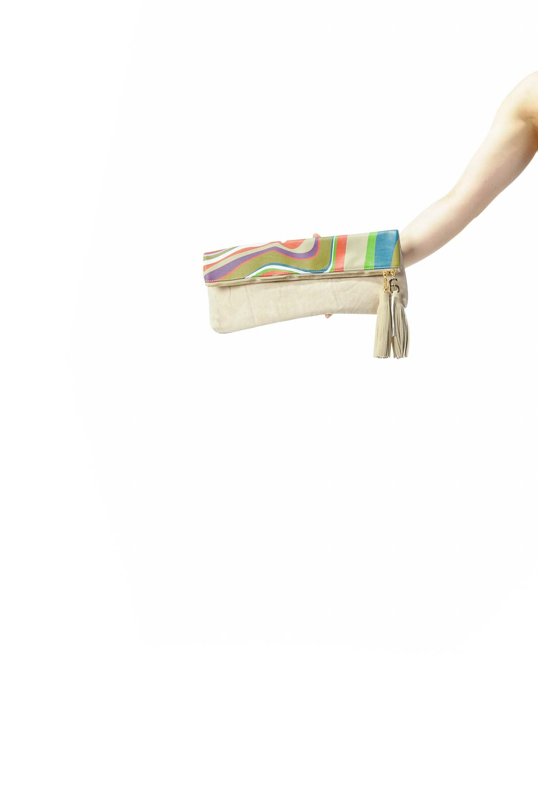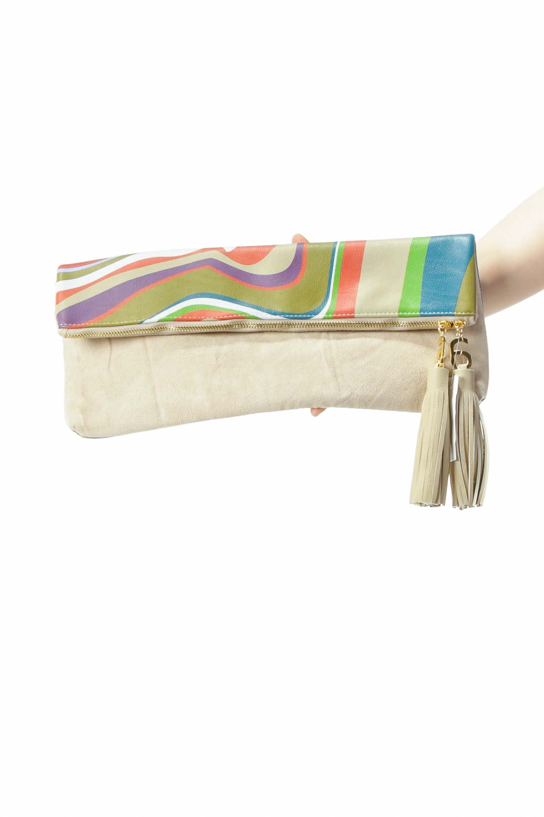 Beige Gold Multicolor Flap-Print Faux-Suede Zippered Clutch with Tassels