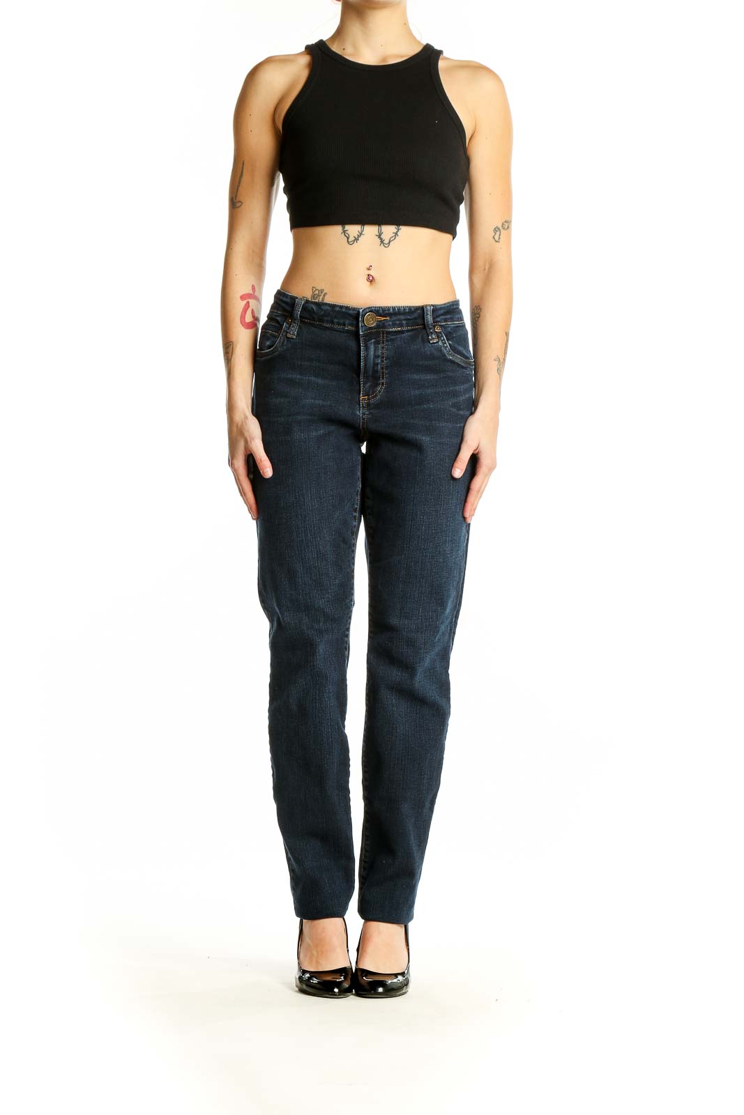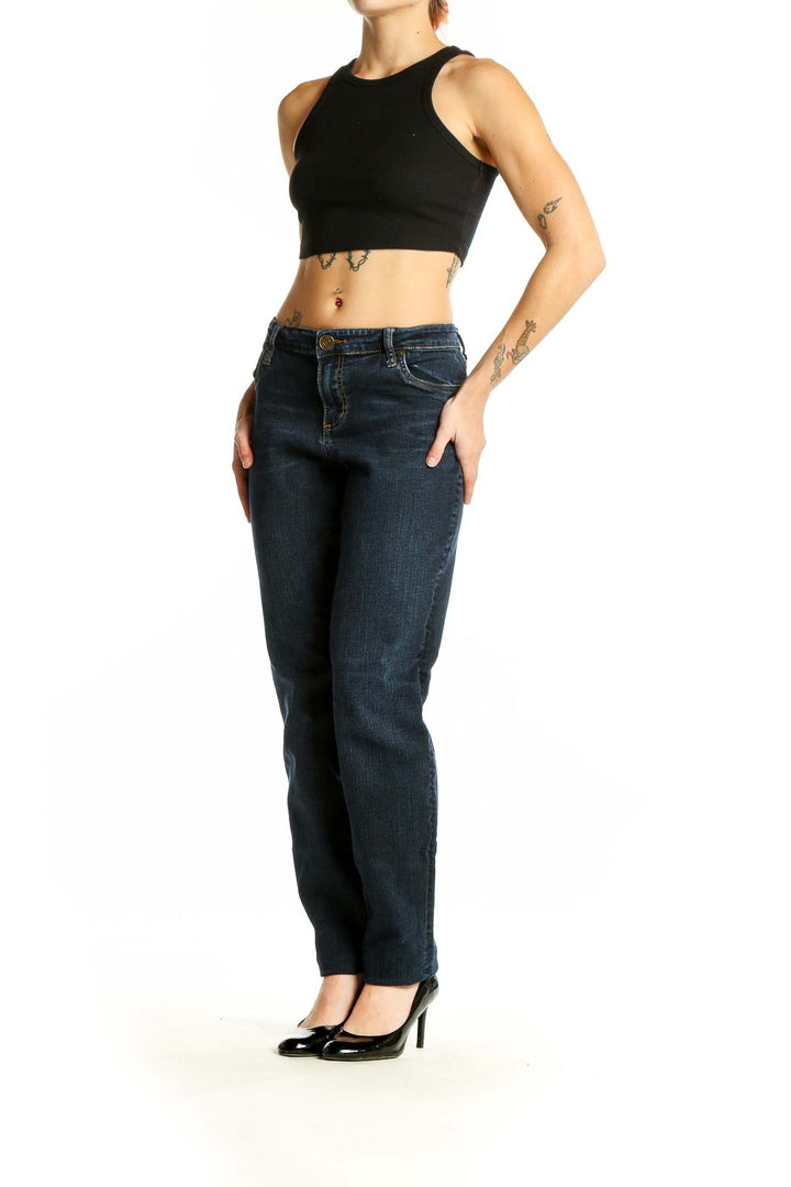 Step into timeless style with these dark blue straight leg jeans from KUT from the Kloth. Crafted from a comfortable blend of cotton and spandex, these jeans offer both durability and stretch for all-day comfort. The classic straight leg silhouette flatters various body types and pairs effortlessly with any top in your wardrobe. With a mid-rise waist and a 39-inch length, these jeans provide excellent coverage and a sleek look. The deep indigo wash adds versatility, making them perfect for both casual outings and dressier occasions. In good condition, these jeans are a reliable staple for your denim collection.