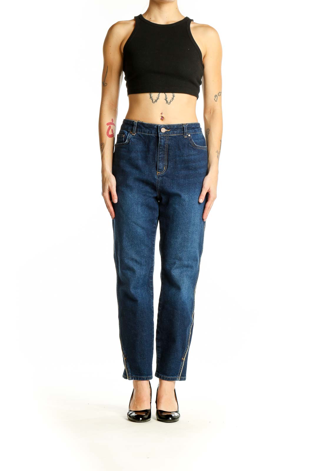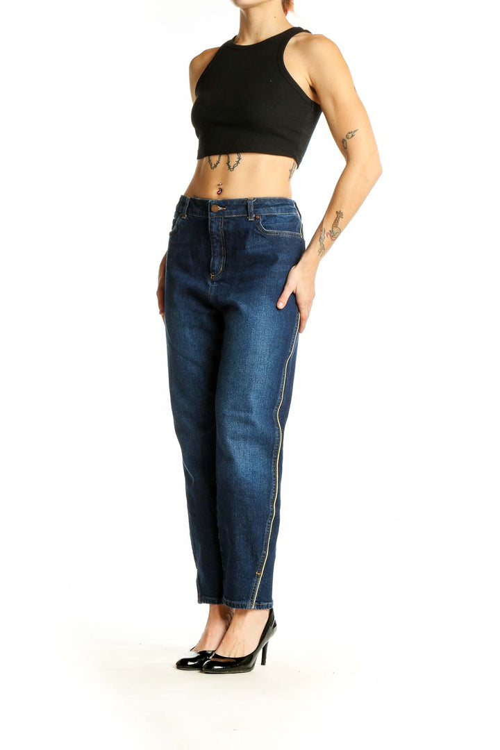 Featuring a rich, dark blue wash, these jeans are perfect for dressing up or down. The side seams are accentuated with a subtle contrast stitching, adding a unique touch to the classic design. The jeans are finished with traditional five-pocket styling and a button closure, maintaining that authentic denim look.