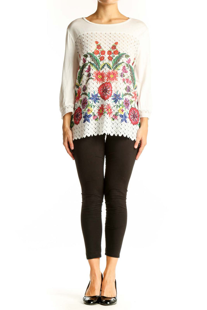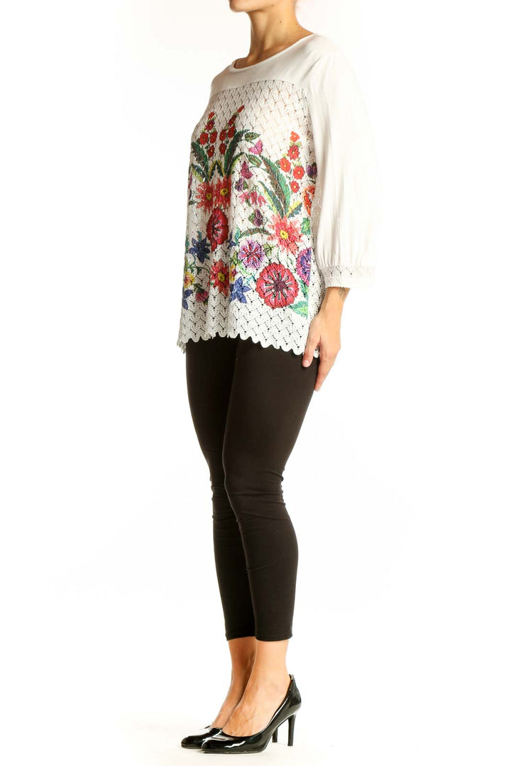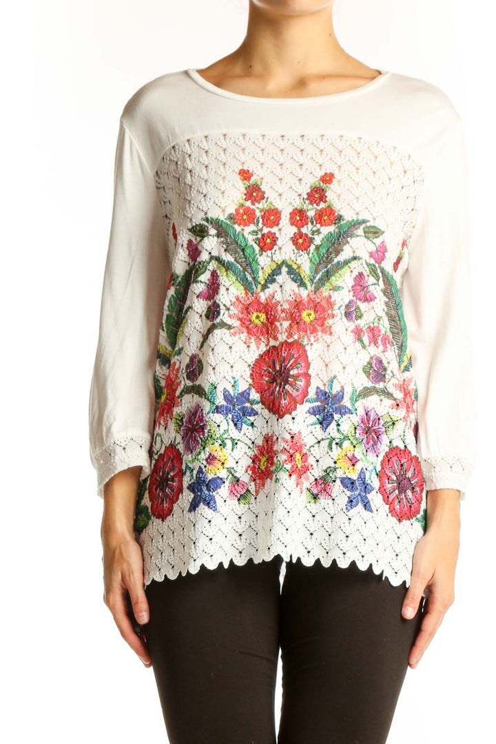 Elevate your style with this stunning white floral embroidered top from Desigual. This exquisite piece features a delicate lace overlay adorned with vibrant, multi-colored floral embroidery that creates a beautiful garden-inspired design. The intricate pattern showcases red, pink, blue, and green blooms, adding a pop of color to the crisp white background.
