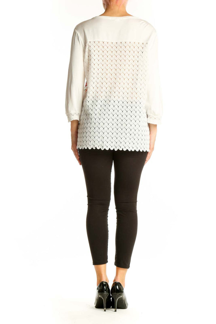 Crafted from soft polyester, this top offers both comfort and elegance. Its relaxed fit and scoop neckline provide a flattering silhouette suitable for various body types. The three-quarter length sleeves with scalloped lace edges add a touch of romance to the overall design.