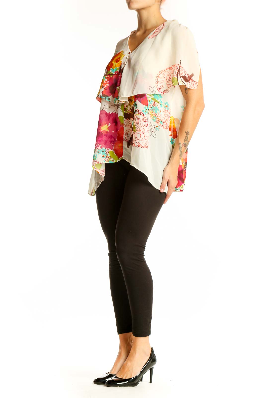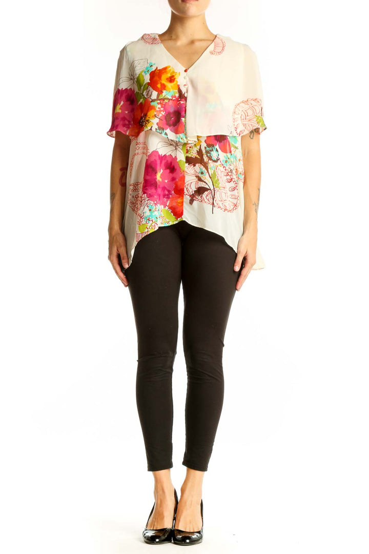 Elevate your wardrobe with this stunning white floral print blouse from Sunny Leigh. This eye-catching top features a beautiful array of vibrant flowers in shades of orange, pink, and turquoise, set against a crisp white background. The layered design adds a touch of elegance and movement to the silhouette, making it perfect for both casual and dressier occasions.