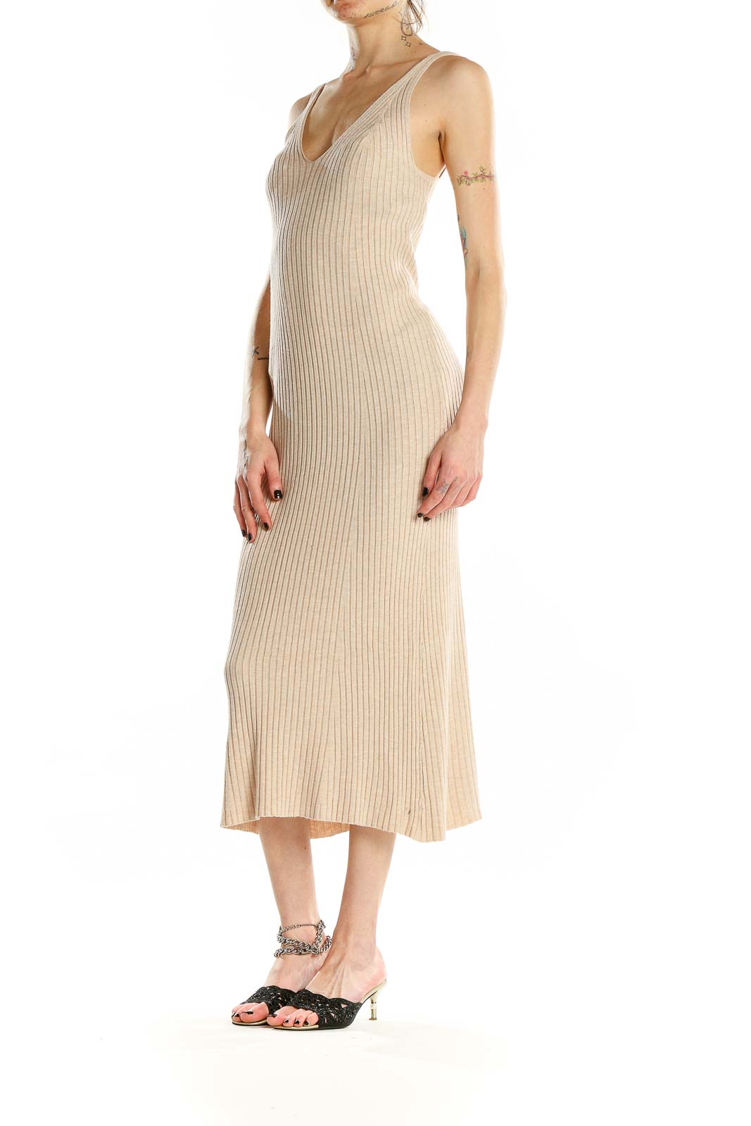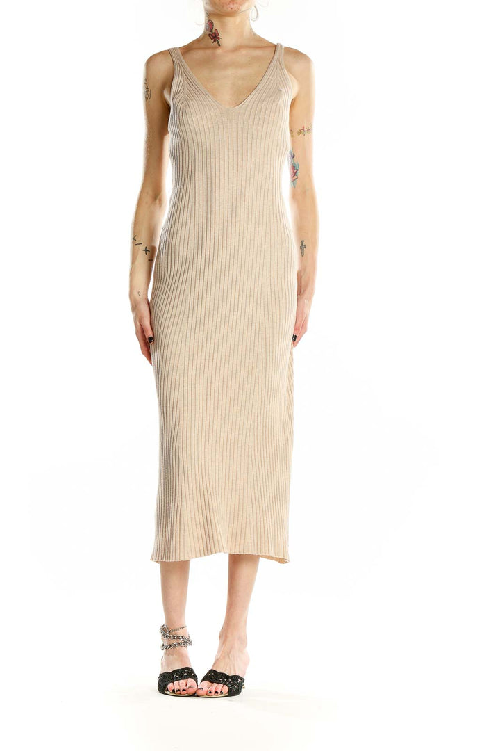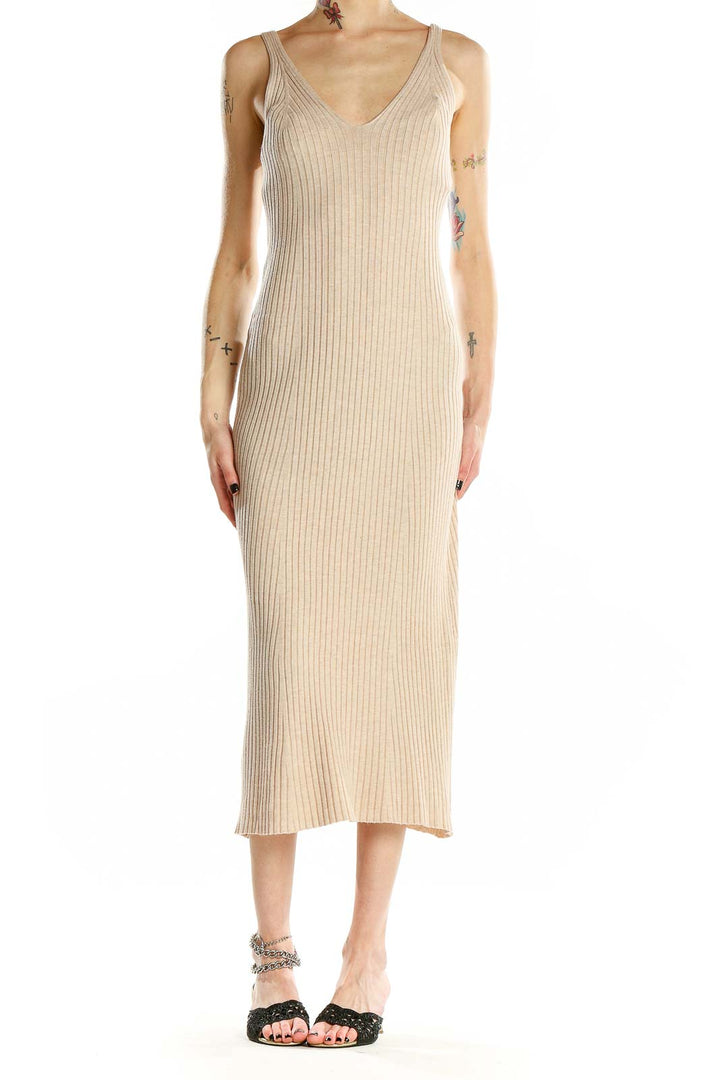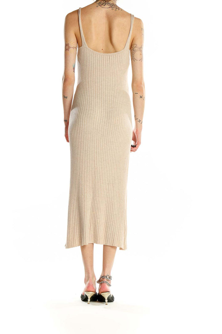Elevate your wardrobe with this stunning beige ribbed midi dress from MNG. Crafted from a luxurious blend of polyamide and viscose, this dress offers both comfort and style. The form-fitting silhouette accentuates your curves while the ribbed texture adds a touch of sophistication. Perfect for various occasions, this versatile piece features a flattering V-neckline and sleek spaghetti straps. The midi length provides elegant coverage, making it suitable for both day and evening wear. In excellent condition, this dress is a testament to MNG's commitment to quality and design. With its neutral beige hue, it's an easy-to-style piece that will become a staple in your closet.