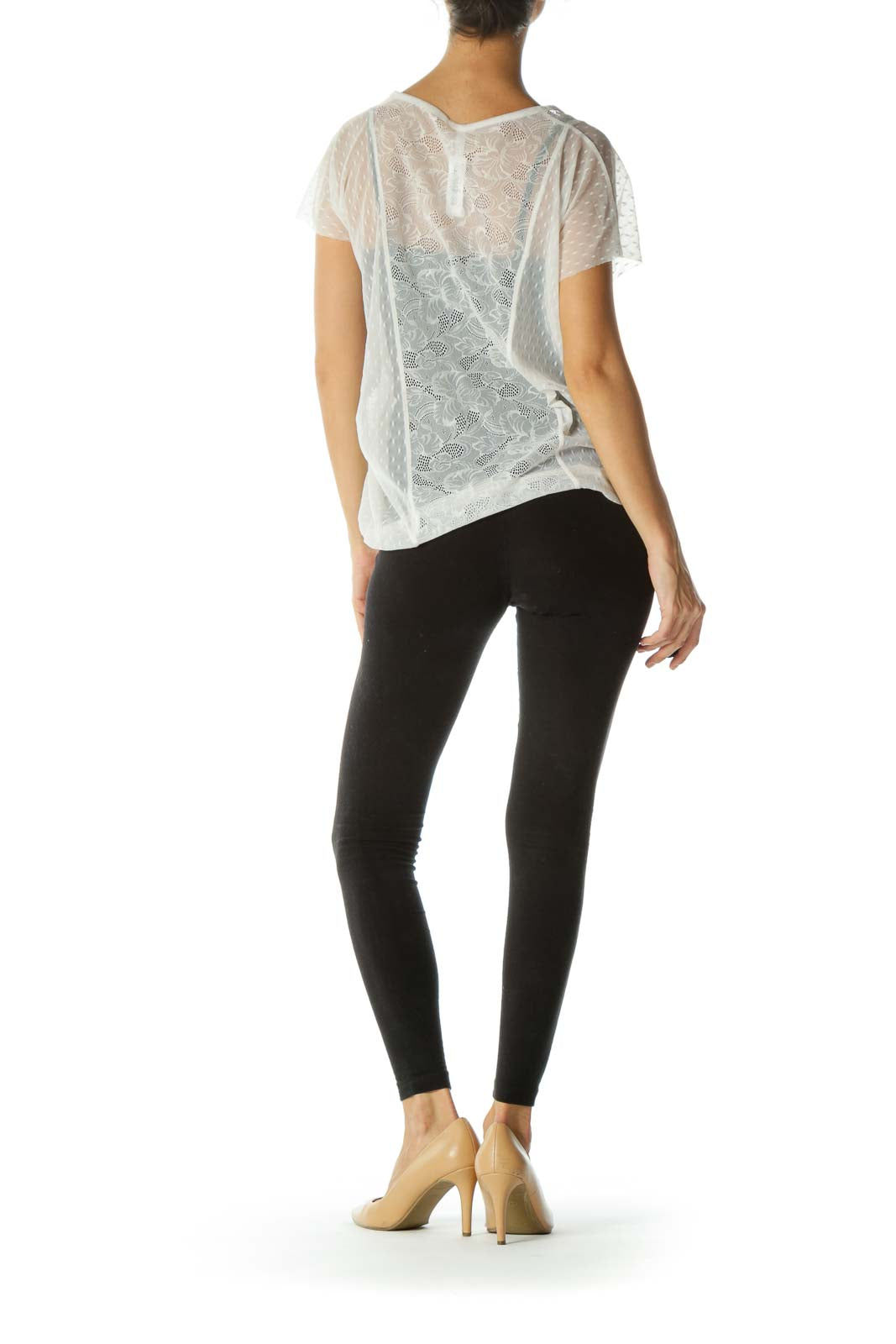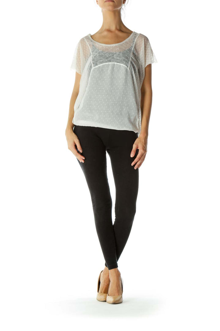 The scoop neckline adds a feminine touch, while the short sleeves provide just the right amount of coverage. The dotted pattern on the lower portion of the top adds a playful element to the design. With its generous measurements of 48" bust and 46" waist, this top offers a comfortable, loose fit that's ideal for layering or wearing on its own.