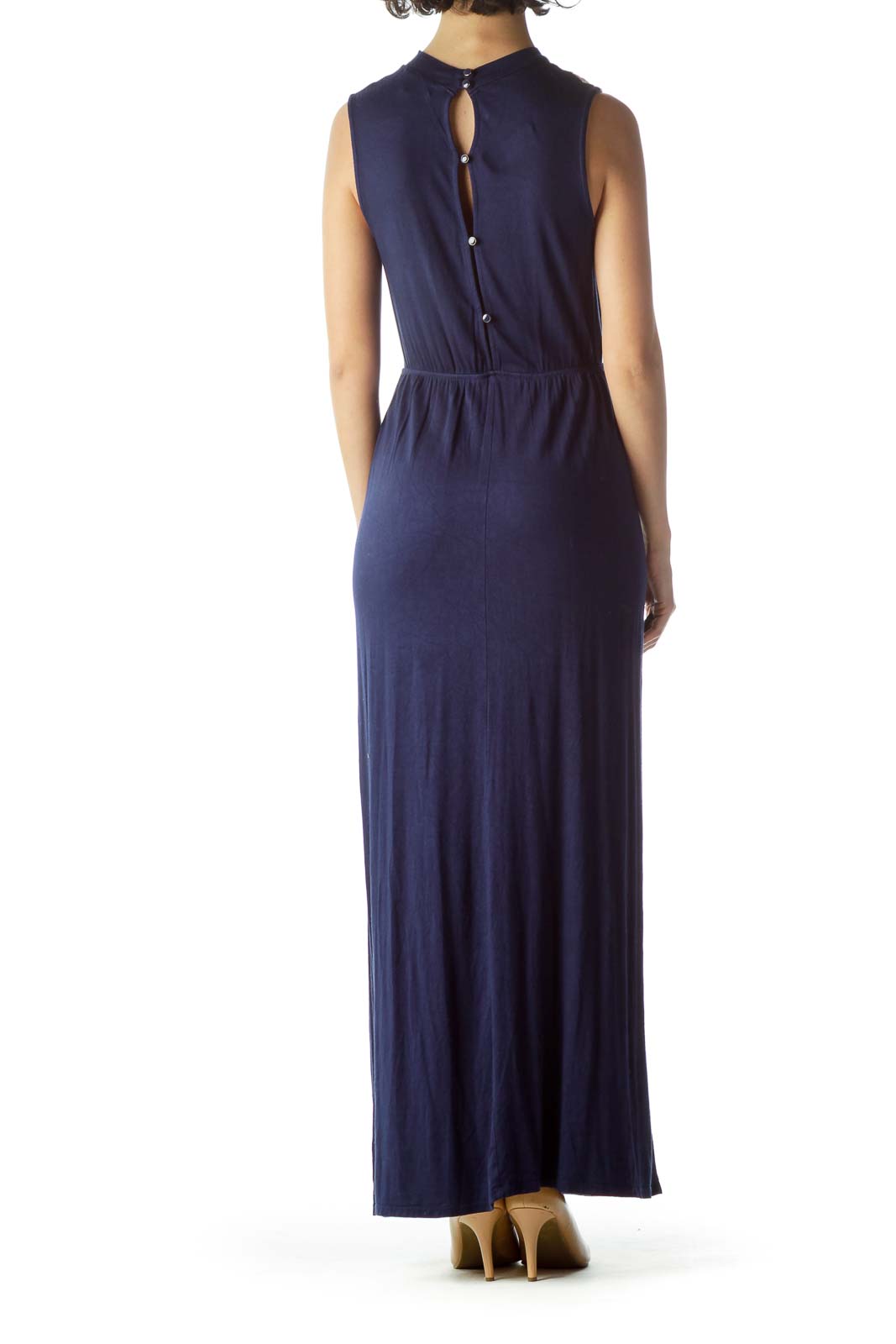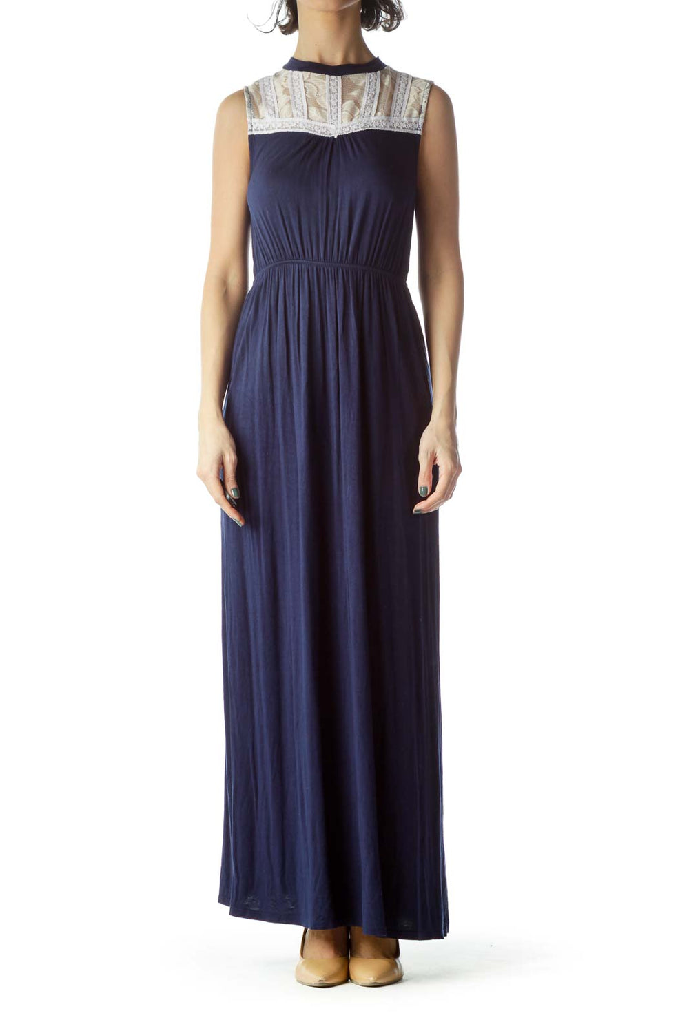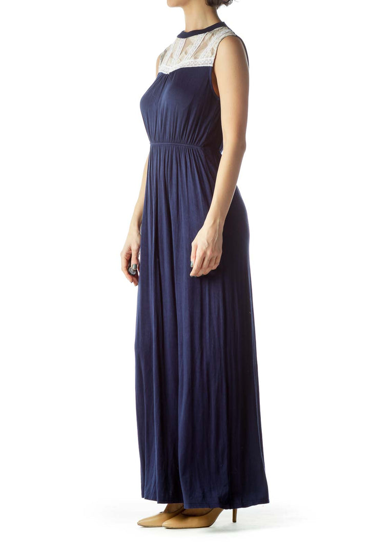 Navy Blue Cream Lace Jersey-Knit Maxi Dress