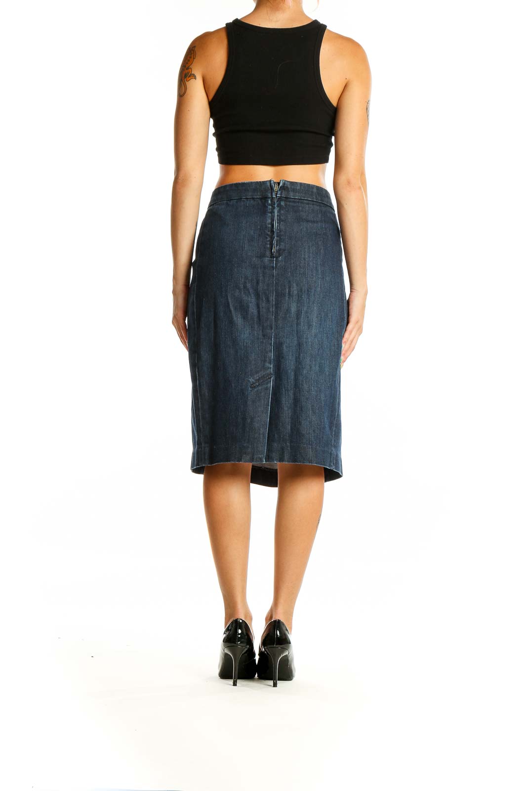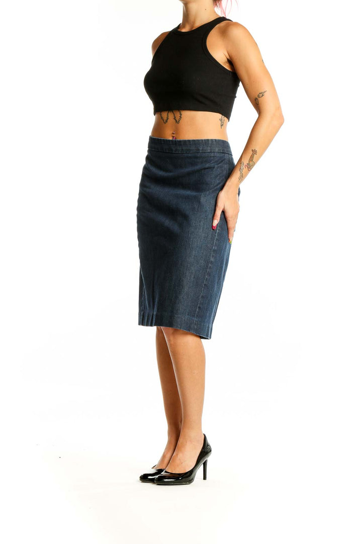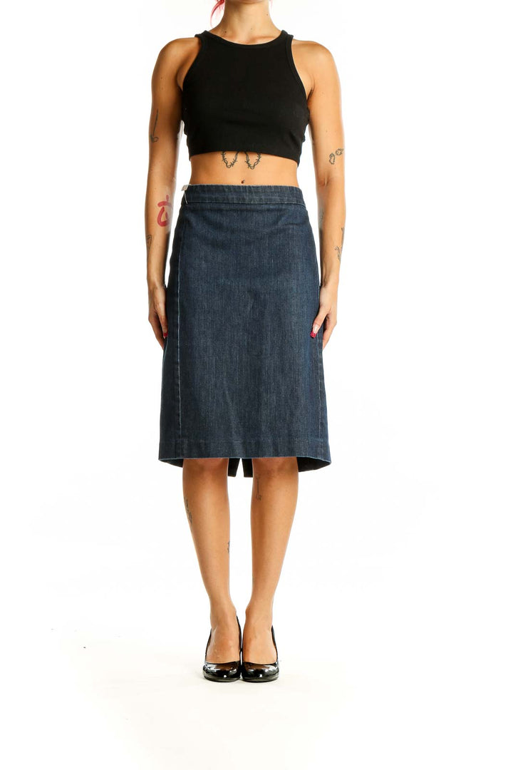 Elevate your casual wardrobe with this sophisticated dark blue denim midi skirt from J.Crew. Crafted from a comfortable blend of cotton and elastane, this A-line skirt offers both style and flexibility. The classic denim design features a high-waisted fit and a flattering A-line silhouette that falls just below the knee, making it a versatile piece for various occasions.