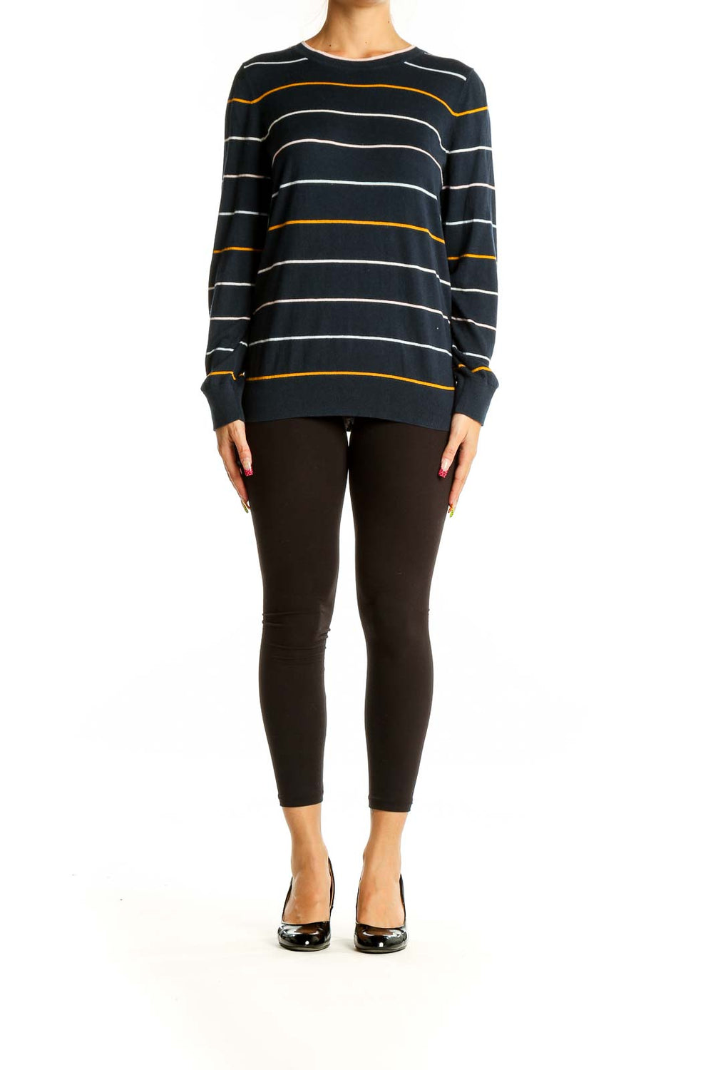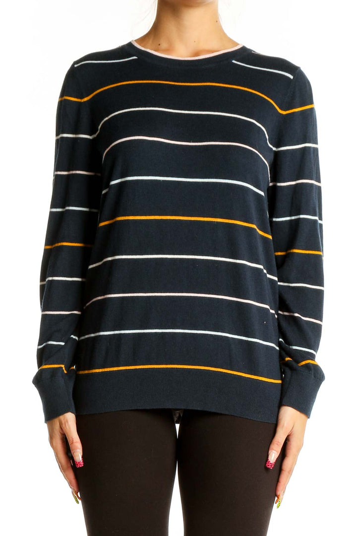 Elevate your casual wardrobe with this sophisticated navy striped sweater from Banana Republic. Crafted from a soft and breathable blend of cotton and viscose, this top offers both comfort and style for everyday wear. The classic crew neck and long sleeves provide a timeless silhouette, while the horizontal stripes in white and mustard yellow add a pop of color and visual interest.