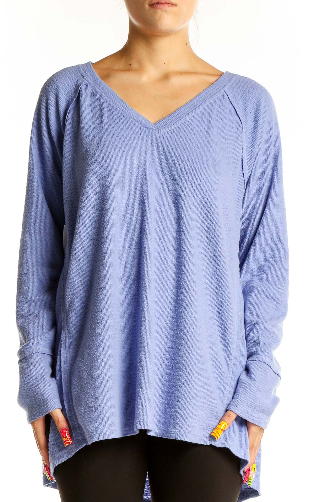 Embrace comfort and style with this periwinkle V-neck oversized knit sweater from WILDFOX. The soft, textured knit fabric is crafted from a cozy blend of polyester, rayon, and spandex, ensuring both warmth and flexibility. Its relaxed silhouette features raglan sleeves and a generous fit, perfect for layering or wearing on its own.