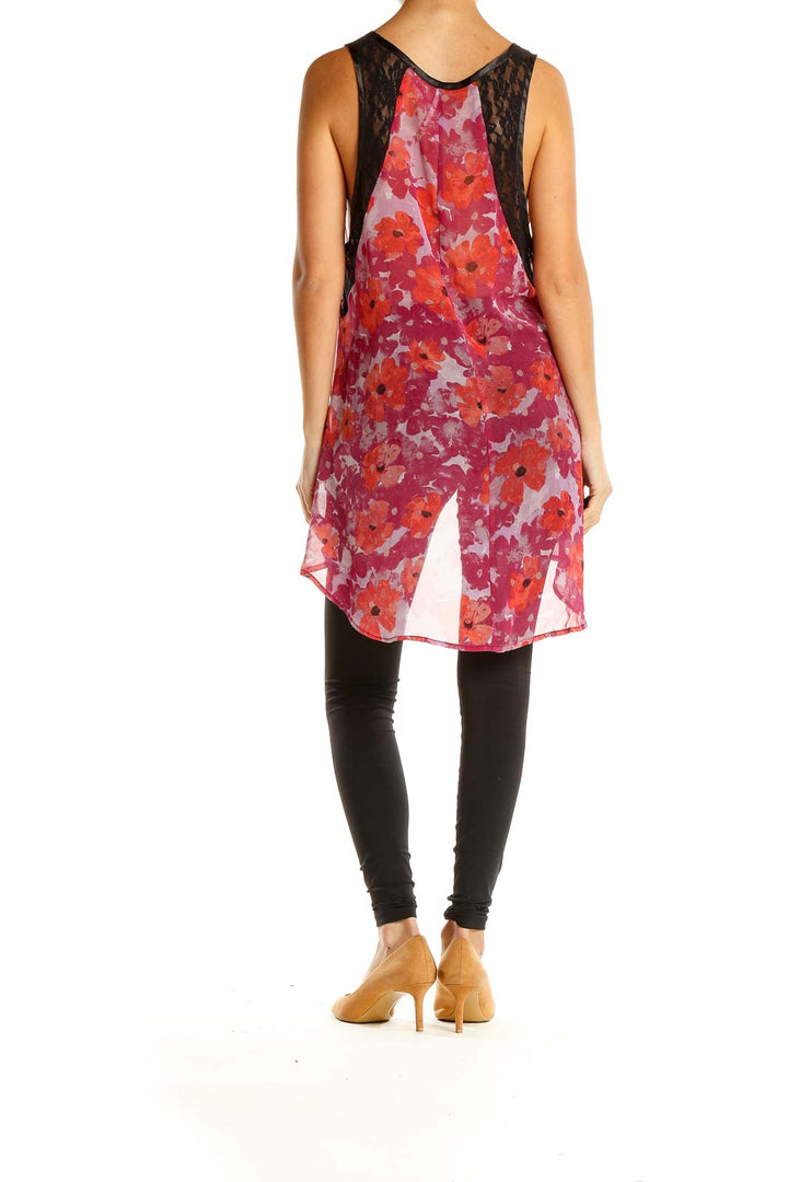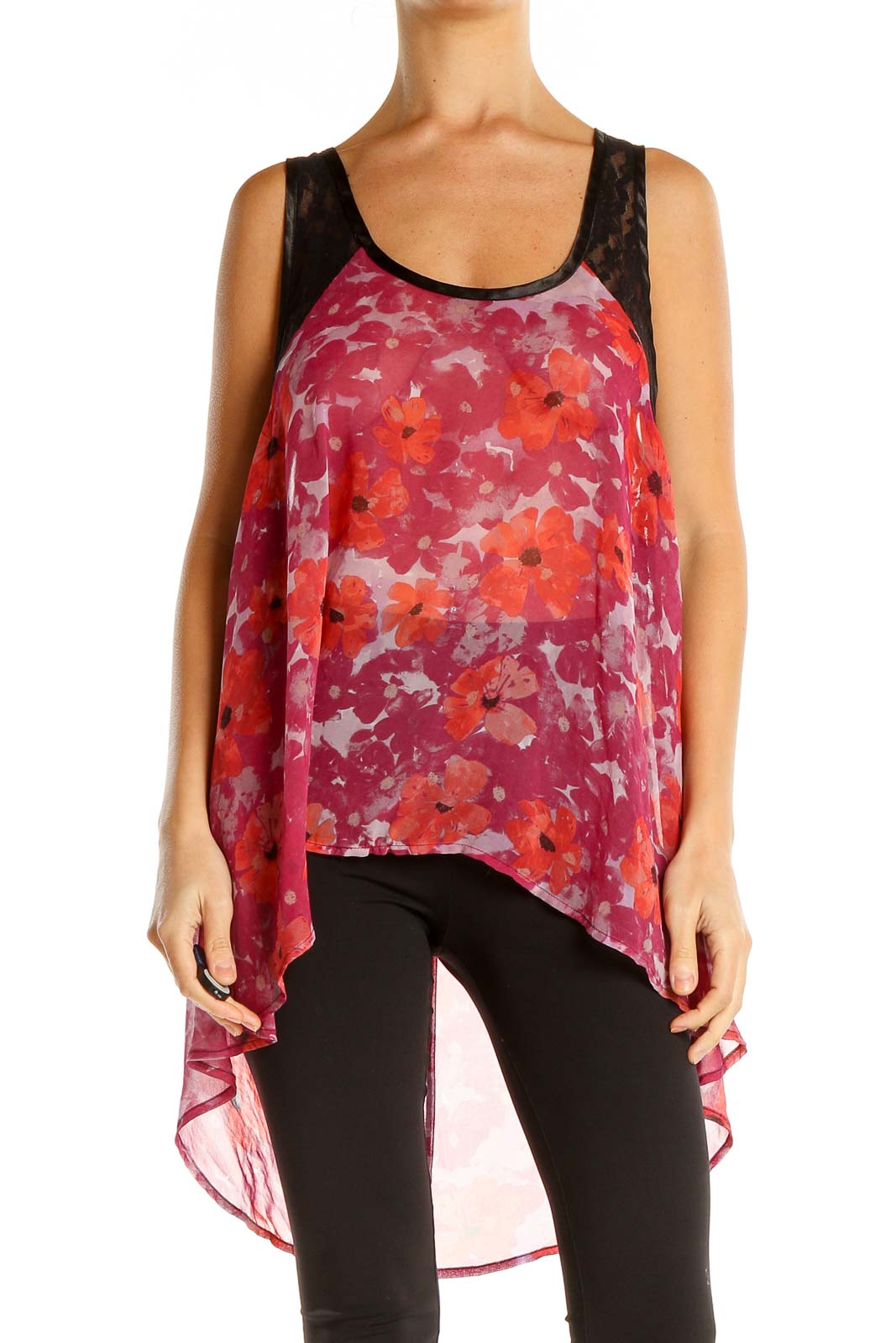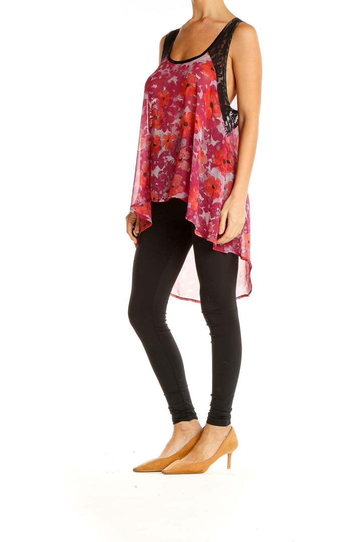 Make a statement with this vibrant Free People tank top in a stunning red floral print. The eye-catching high-low silhouette features a flowy chiffon body in shades of red, pink, and orange, creating a watercolor-like floral pattern that's perfect for warm weather. Black lace panels at the shoulders add an elegant touch of contrast and texture.
