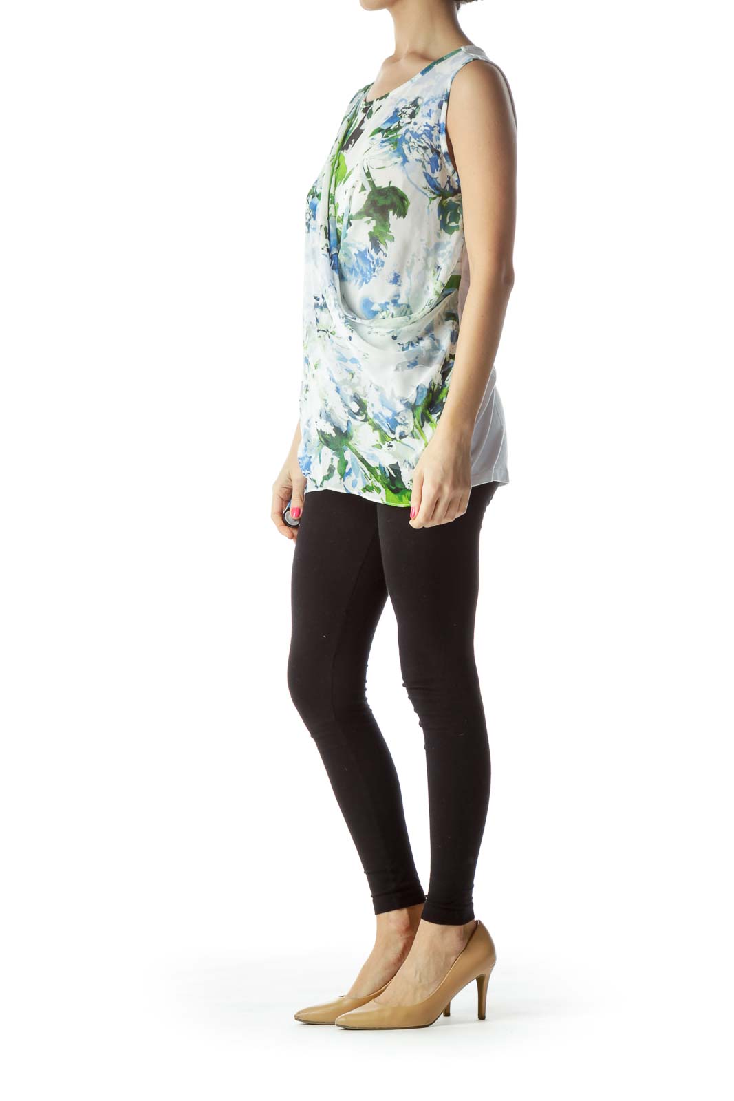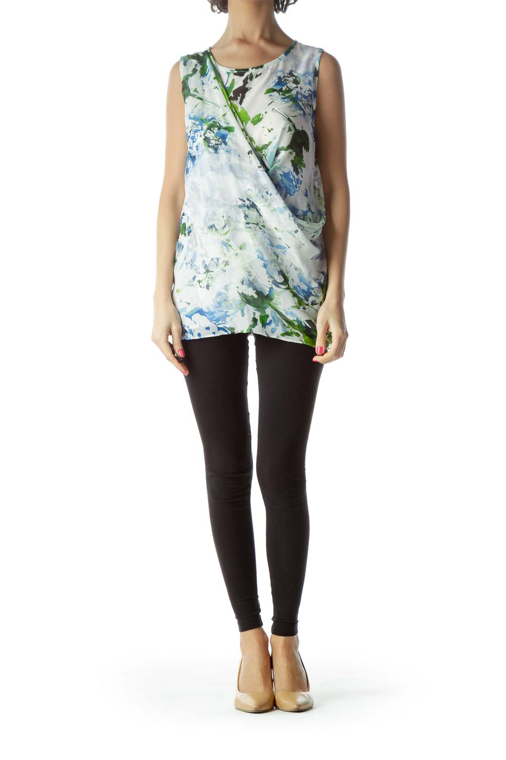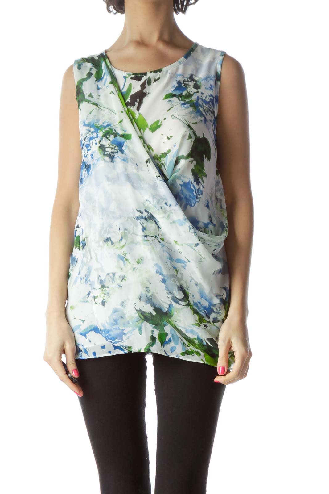 Designed with a unique wrap-style front, this top offers a modern twist on a classic silhouette. The sleeveless cut provides comfort and versatility, making it ideal for layering or wearing on its own. The subtle watercolor-like effect of the floral pattern adds an artistic touch, ensuring you'll stand out in any crowd.