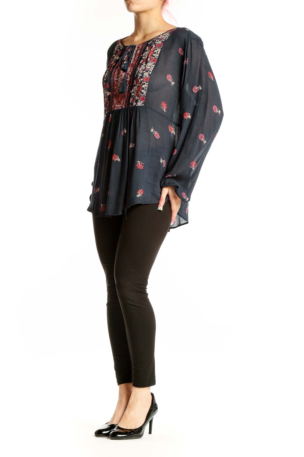 Designed for comfort and style, this top boasts billowy long sleeves and a relaxed fit that drapes beautifully. The scoop neckline with tassel-tied closure allows for adjustable coverage and adds a playful element. The empire waistline creates a flattering silhouette suitable for various body types.