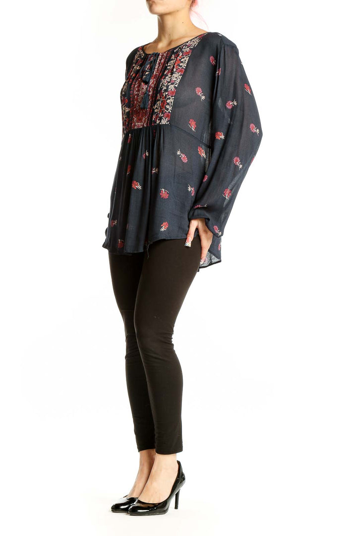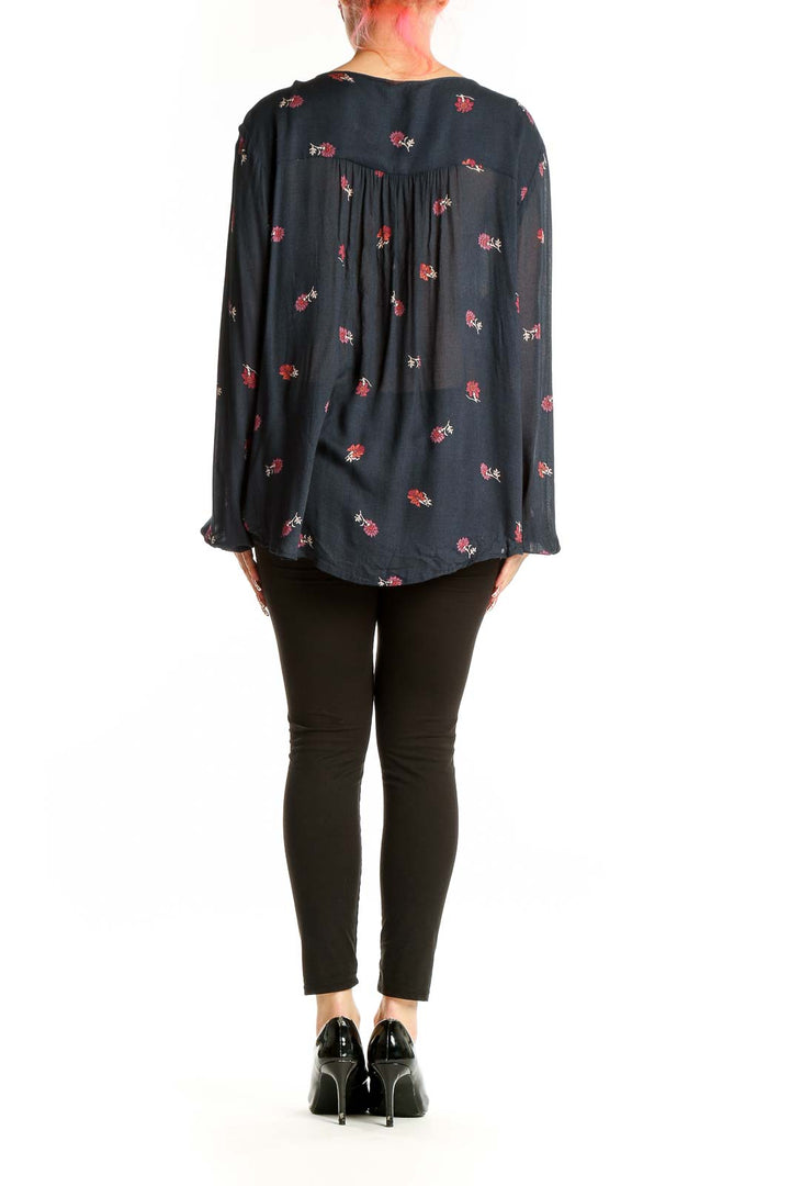 Embrace bohemian chic with this charming black floral peasant blouse from Lucky Brand. The flowing viscose fabric features a delicate red floral print scattered throughout, creating a romantic and feminine look. The front panel showcases an intricate mix of floral patterns in red, white, and black, adding visual interest and a touch of vintage appeal.