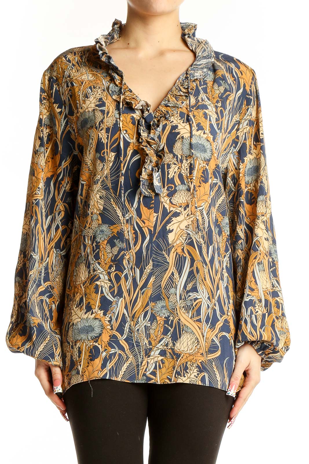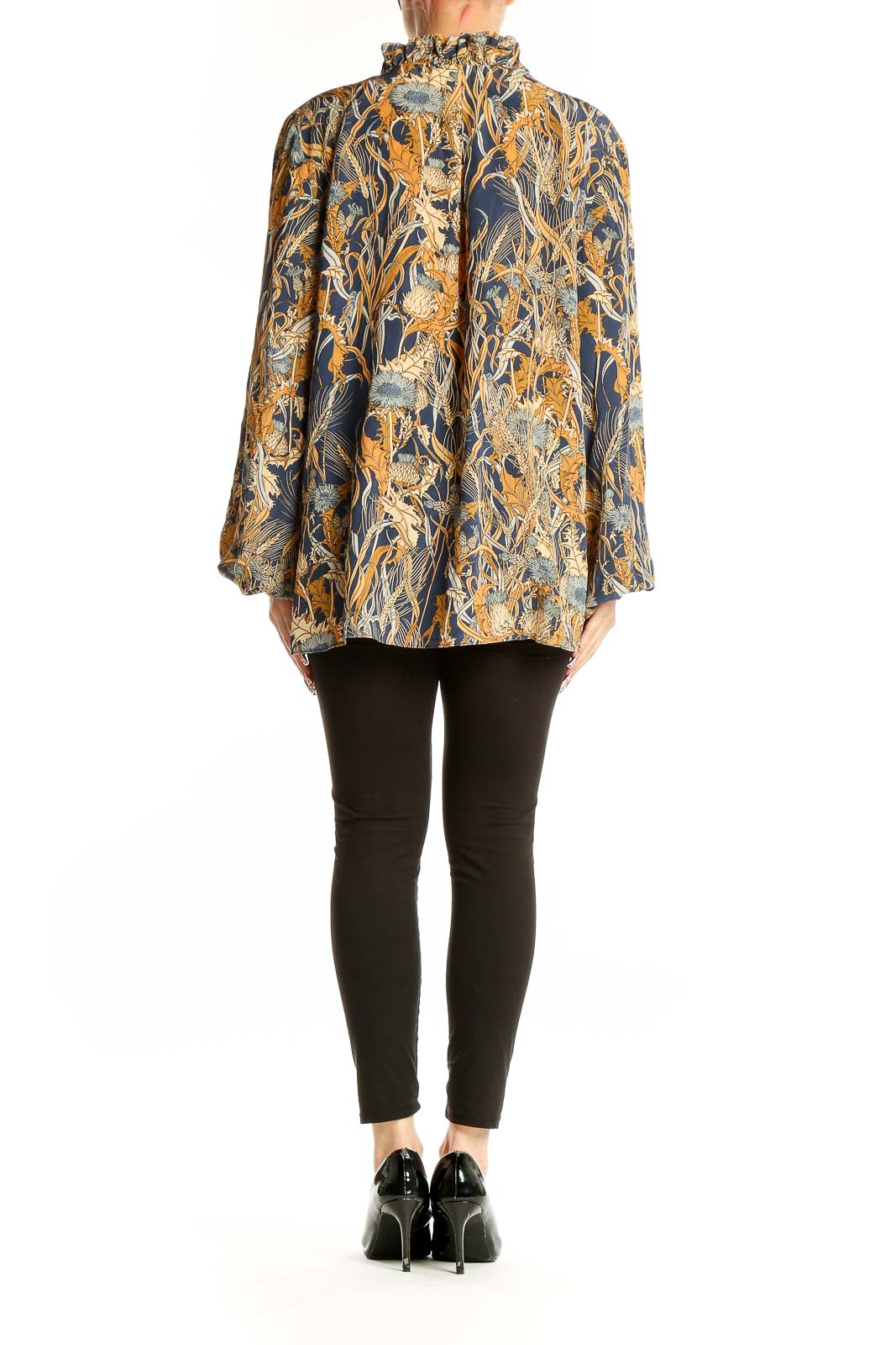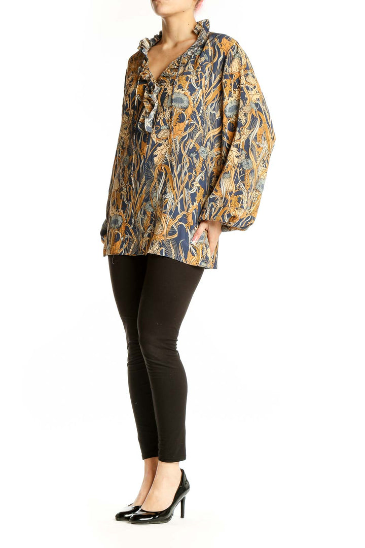 Elevate your wardrobe with this exquisite navy floral silk blouse by Tyler Boe. The luxurious silk fabric drapes beautifully, featuring an eye-catching pattern of golden flowers and silvery leaves against a deep navy background. The standout ruffle-neck collar adds a touch of feminine charm, while the billowing bishop sleeves create a dramatic silhouette. Perfect for both office wear and evening occasions, this blouse combines comfort with sophistication. The excellent condition speaks to its quality craftsmanship. With generous measurements of 46" bust, 42" waist, and 28" length, this XL-sized top offers a relaxed, flattering fit for a variety of body types. Embrace elegance with this versatile and stylish Tyler Boe creation.