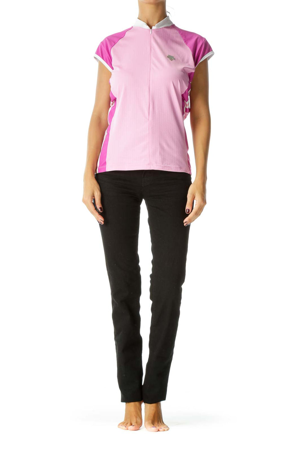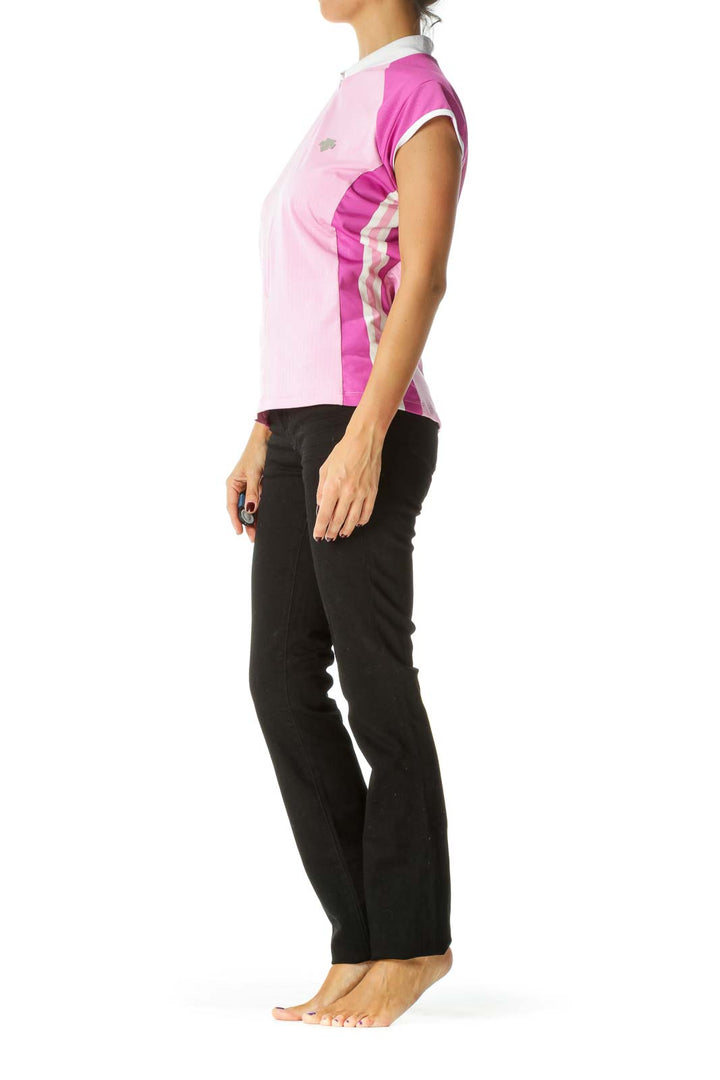 Pink Purple White Zippered Short Sleeve Reflective Logo Applique Sports Top